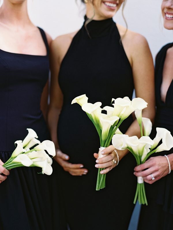 Our flowers were beautifully arranged by Studio Flourish. We were referred to Nadine by good friends of ours, and we got to know her so well during our year of wedding planning. She was so enthusiastic, passionate, talented & receptive to our vision. She truly made it all come to life while working within our budget. I chose for all 16 of my bridesmaids to hold a simple bouquet of calla lilies that went perfectly with their black dresses. I had an assortment of ivory florals with a pop of baby blue in my bridal bouquet. She did a wonderful job with bud vases, our altar,r and all other large statement pieces around the venue with similar florals and colors.