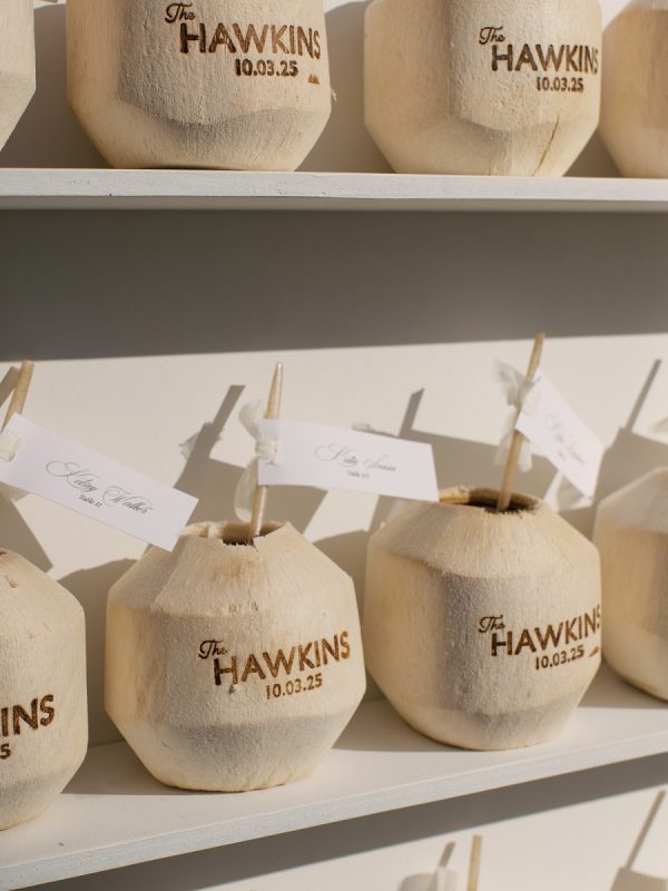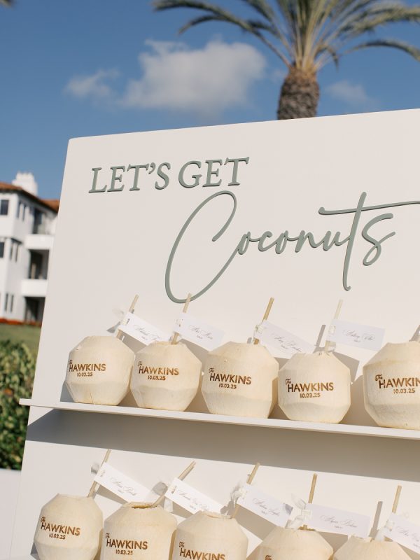 A special detail worth noting: We used fresh coconuts on a display wall as our escort cards! This was a fun, unique, and memorable way to give our guests the gift of fresh coconut water (helpful before all of the drinking …) while being used for table assignments for each guest. WindandSea Coconuts did a personal branding on each coconut,t and we had a beautiful display wall that held all 200 coconuts, which filled our reception space perfectly.
