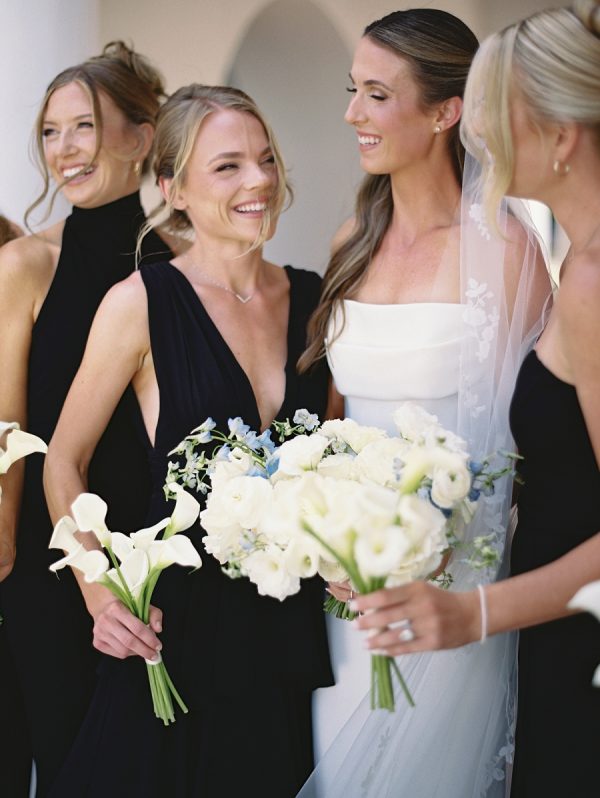 Although our wedding was not black tie, I wanted our wedding party to be in long black dresses and black tuxes. We had a very large wedding party (16 bridesmaids & 14 groomsmen), so black felt the most clean and timeless. I did, however, allow each bridesmaid to choose their own black dress so we had a beautiful variety of silhouettes and everyone looked and felt beautiful in the dress of their choice!