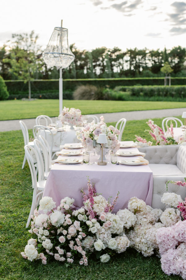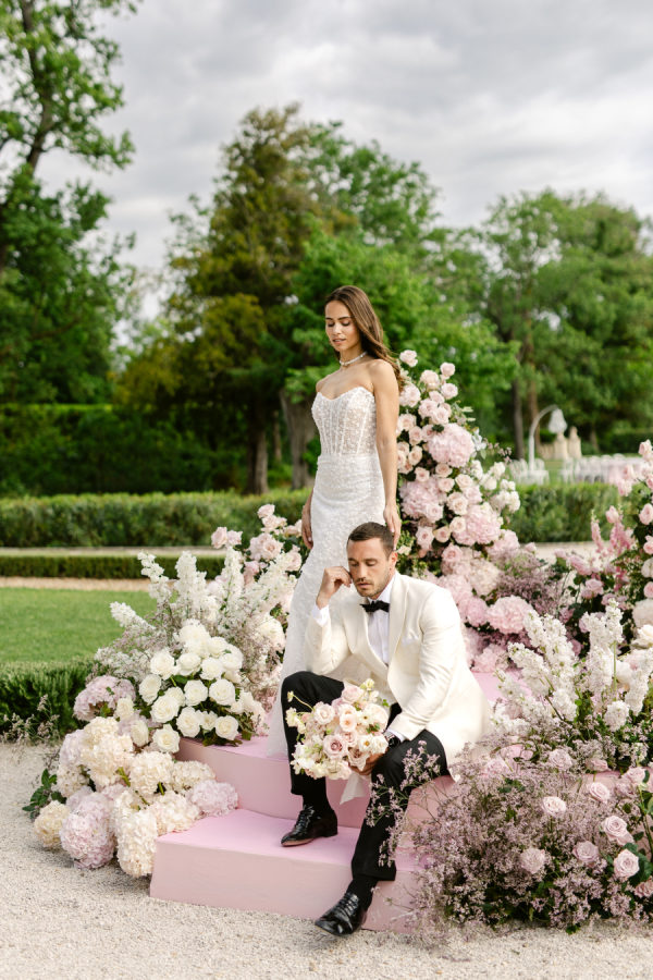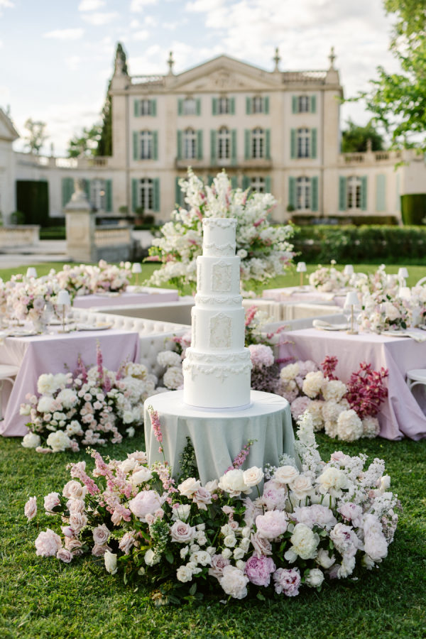 The centerpiece floral installation surrounding the wedding cake was undoubtedly the standout design element. Positioned at the heart of the reception setup, the towering white cake was encircled by a lush carpet of pastel flowers—peonies, roses, and hydrangeas—creating a visual masterpiece. This breathtaking arrangement not only elevated the cake display but also served as a focal point that seamlessly tied together the elegance of the tablescape and the grandeur of Château de Tourreau’s gardens. It was the perfect fusion of romance and luxury, embodying the editorial spirit of the shoot.