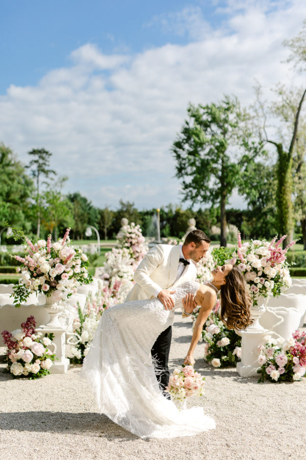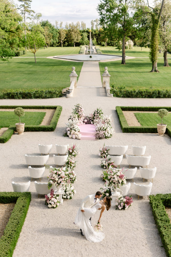 Château de Tourreau, located in the heart of Provence, is the epitome of French elegance. Its grand façade, adorned with pastel green shutters and stone-carved details, sets the perfect backdrop for a luxury wedding. The expansive gardens, featuring manicured pathways, fountains, and symmetrical hedges, add to the sense of grandeur. For this editorial, the ceremony was beautifully staged in the gardens, with a floral arch and a chic seating arrangement that seamlessly blended with the estate’s timeless beauty.