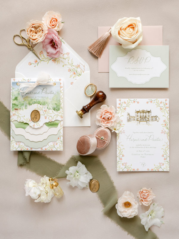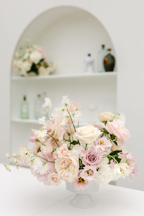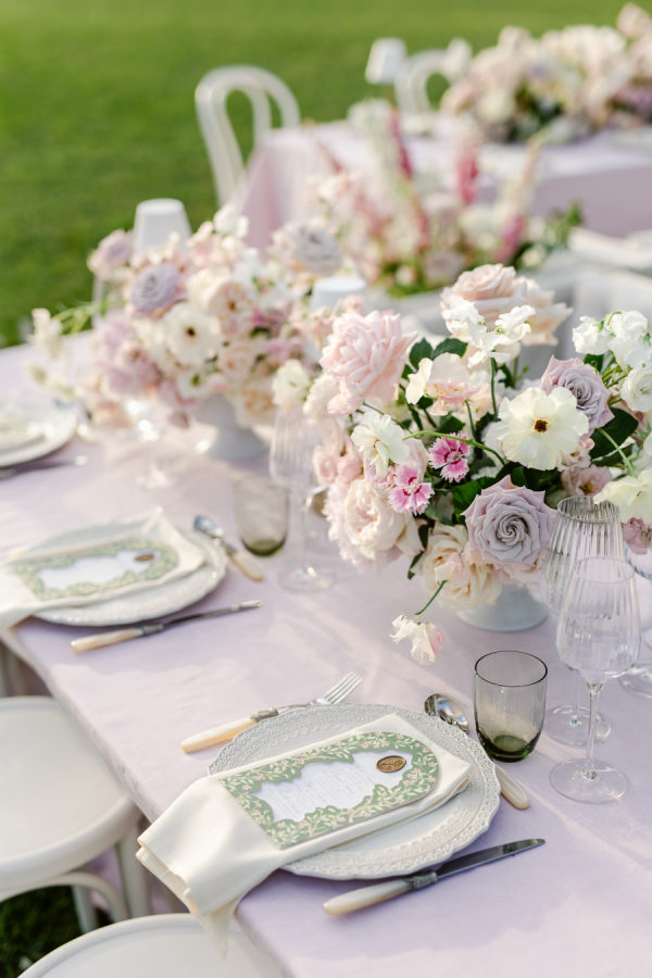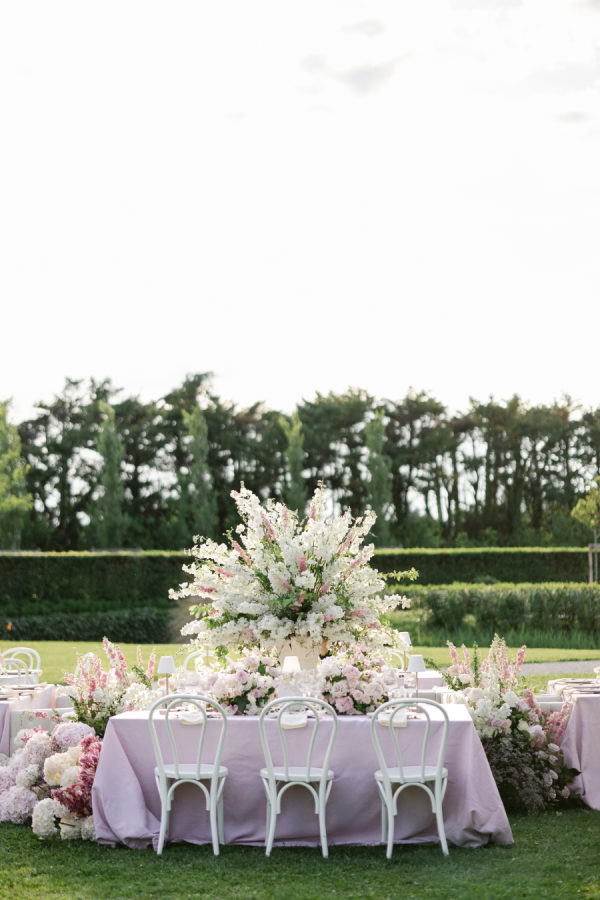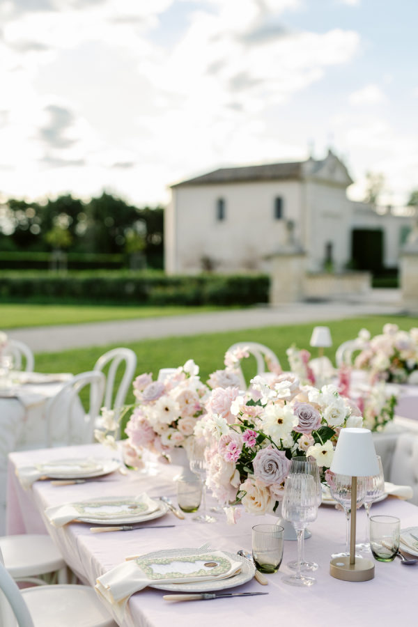 The chosen palette was a delicate mix of blush pink, ivory, soft lavender, and hints of sage green. These colors were carefully selected to complement the timeless architecture of Château de Tourreau and the lush greenery of its gardens. The floral designs were a harmonious blend of roses, peonies, and hydrangeas in soft pastel tones, contrasted with rich foliage for added depth. This gentle palette contributed to the dreamy and romantic atmosphere of the entire event.
