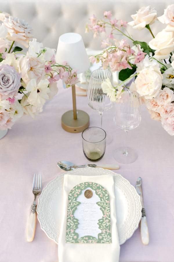 Floral design played a central role in elevating the ambiance of the event. Lush arrangements of peonies, roses, hydrangeas, and delphiniums in soft pastel shades framed each setting, from the ceremony aisle to the reception tables. The design concept focused on creating a flow of natural elegance, with floral installations cascading onto tables and intertwining with chandeliers. The reception area, styled with white and blush linens, was adorned with crystal chandeliers and luxurious tableware, capturing the essence of refined French luxury.