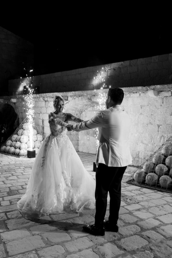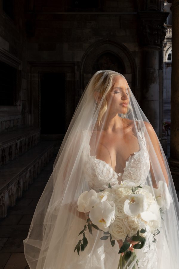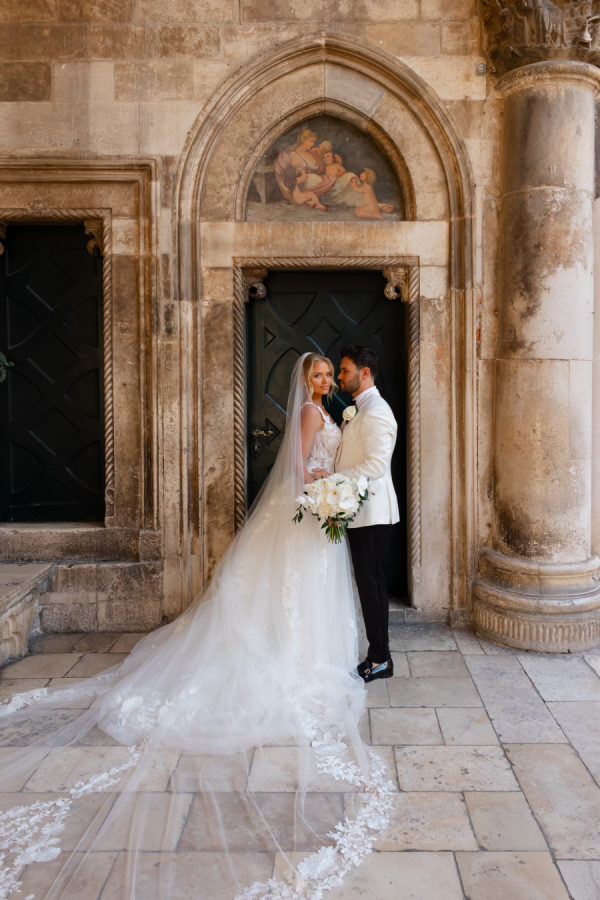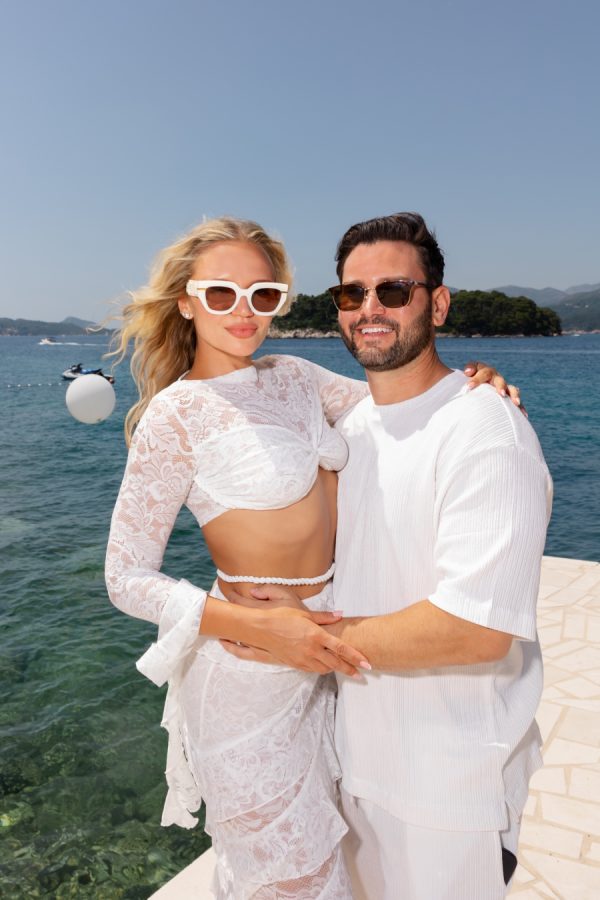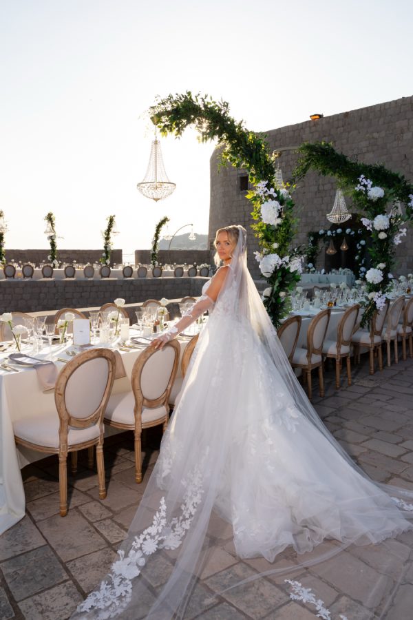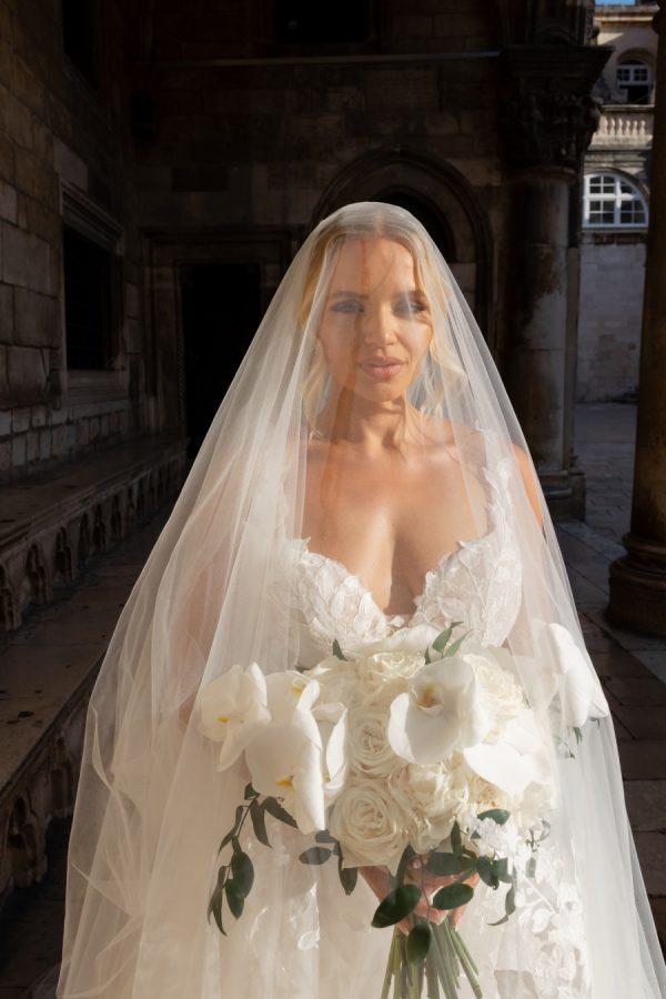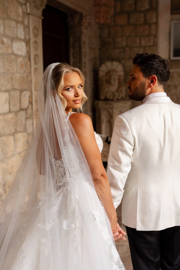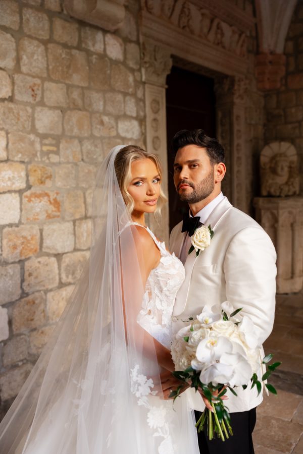 The celebrations began the evening before the wedding, when Veronika set the tone in an embellished Elliatt dress styled with a sheer neck scarf, Dior pearl-and-crystal earrings, white Louboutin heels, and oversized Gucci sunglasses. The look was a nod to old-Hollywood icons, equal parts glamorous and playful. For the ceremony, she stepped into a signature Pronovias gown discovered at the brand’s flagship in Beverly Hills. The moment she slipped into the gown, she knew it was the ONE. With its lace, crystal embellishments, and soft layers of tulle, the design felt like it had been created for a castle setting. A Vera Wang embroidered veil, Jimmy Choo shoes, Soleil gloves, and a delicate petticoat completed the look. The jewelry remained timeless and personal: diamond earrings from Happy Jewelers, the same jeweler where the couple chose their engagement and wedding bands. As the reception unfolded, Veronika made a second entrance in a couture gown by Fjolla Haxhismajli, a unique and Custom statement piece that was both sensual and unforgettable. Under the night sky, with Justin Jesso performing Stargazing and sparklers illuminating the courtyard, the scene felt straight out of a movie. When it was time to dance into the early hours, Veronika transformed once more, this time into a chic short white dress finished with a dramatic bow. The night ended in true Dubrovnik style at Revelin, the city’s legendary cave club, an adventurous finale to a wedding crafted to be nothing short of unforgettable.