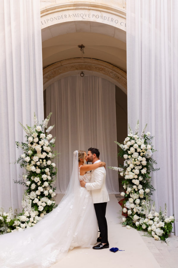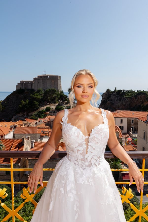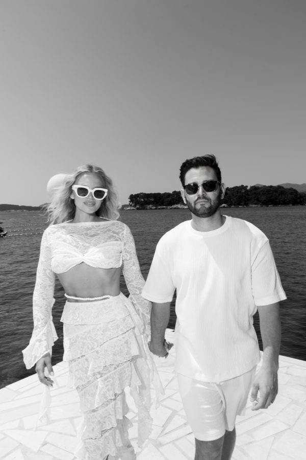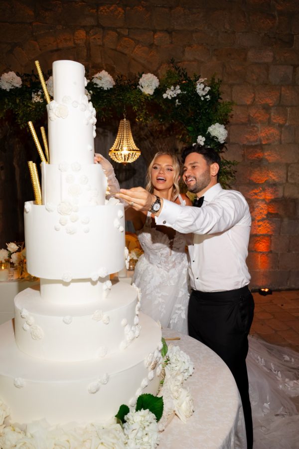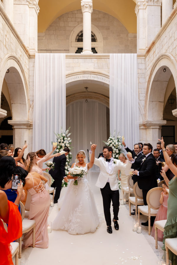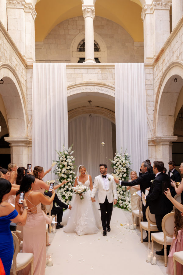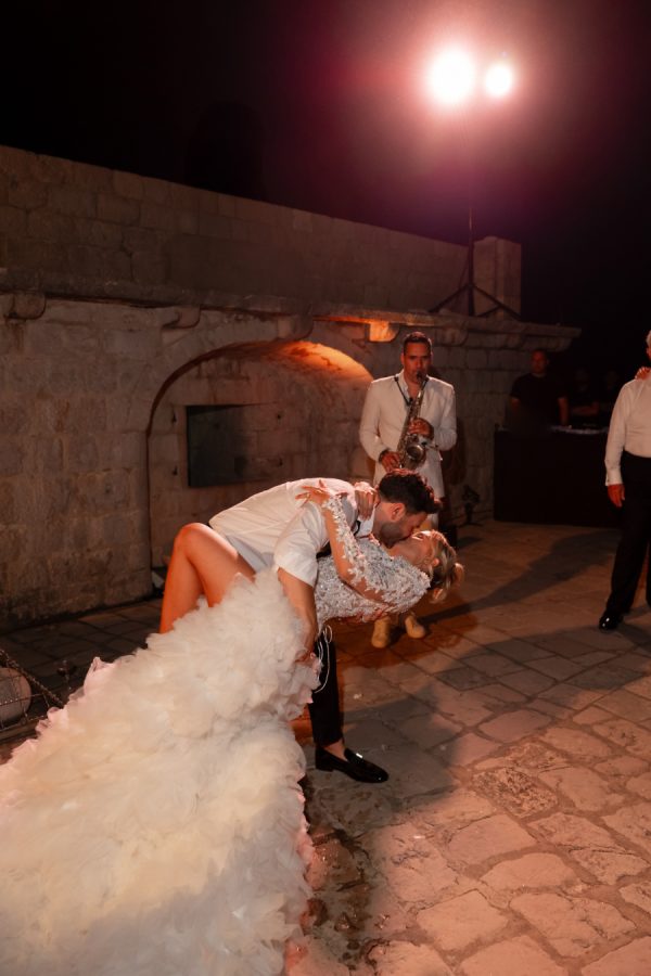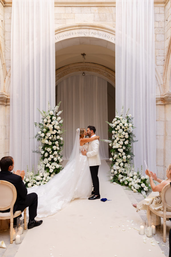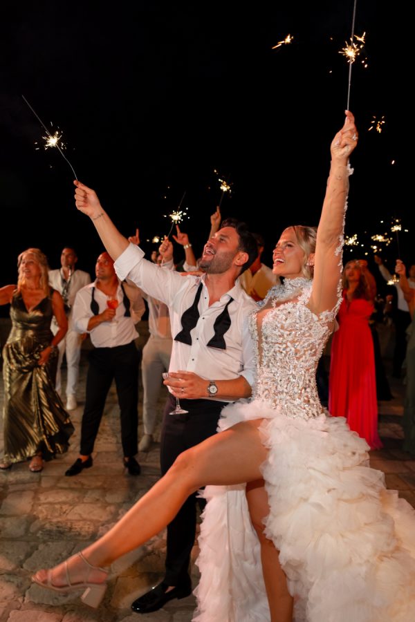 The celebrations began the evening before the wedding, when Veronika set the tone in an embellished Elliatt dress styled with a sheer neck scarf, Dior pearl-and-crystal earrings, white Louboutin heels, and oversized Gucci sunglasses. The look was a nod to old-Hollywood icons, equal parts glamorous and playful. For the ceremony, she stepped into a signature Pronovias gown discovered at the brand’s flagship in Beverly Hills. The moment she slipped into the gown, she knew it was the ONE. With its lace, crystal embellishments, and soft layers of tulle, the design felt like it had been created for a castle setting. A Vera Wang embroidered veil, Jimmy Choo shoes, Soleil gloves, and a delicate petticoat completed the look. The jewelry remained timeless and personal: diamond earrings from Happy Jewelers, the same jeweler where the couple chose their engagement and wedding bands. As the reception unfolded, Veronika made a second entrance in a couture gown by Fjolla Haxhismajli, a unique and Custom statement piece that was both sensual and unforgettable. Under the night sky, with Justin Jesso performing Stargazing and sparklers illuminating the courtyard, the scene felt straight out of a movie. When it was time to dance into the early hours, Veronika transformed once more, this time into a chic short white dress finished with a dramatic bow. The night ended in true Dubrovnik style at Revelin, the city’s legendary cave club, an adventurous finale to a wedding crafted to be nothing short of unforgettable.