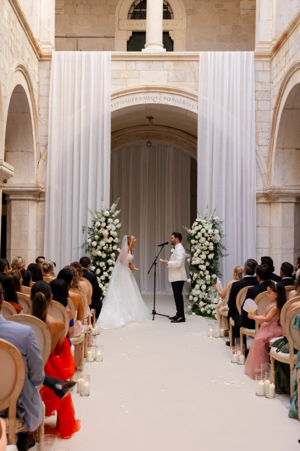 [field title=”Florals & Decor”]At the historic Sponza Palace, guests were welcomed by the soft glow of incense burning in crystal shells, setting a mood of mystique and intimacy. Each seat was adorned with a fan-shaped hand fan, white roses lined the aisle, and hundreds of candles highlighted an arch of ivory blooms and greenery at the altar.