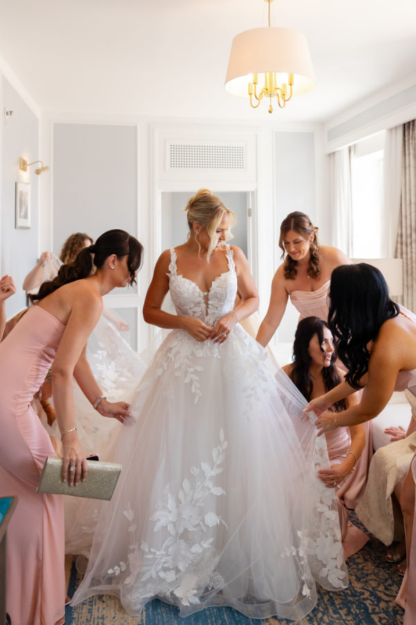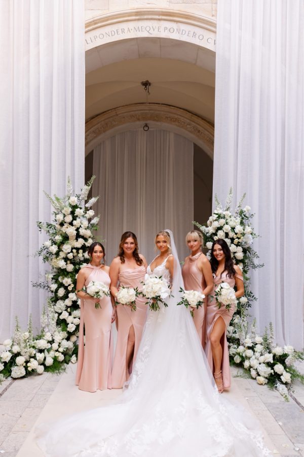 [field title=”Bridesmaid Dresses”]The wedding morning began in coordinated style, with the bridesmaids, bride tribe, and officiant all wearing matching personalized rose-velvet and satin robes from Homebodii, while Veronika stood out in classic white. Later, they changed into rose-gold gowns from Azazie Bridal. In the lead-up to the wedding, Azazie hosted a special fitting where each bridesmaid tried on different silhouettes to find the one they loved most. The result was a collection of stunning gowns in the same luminous shade, each with its own unique shape, allowing every woman to feel equally beautiful, celebrated, and confident, while still creating a harmonious, picture-perfect bridal party look.[/field]