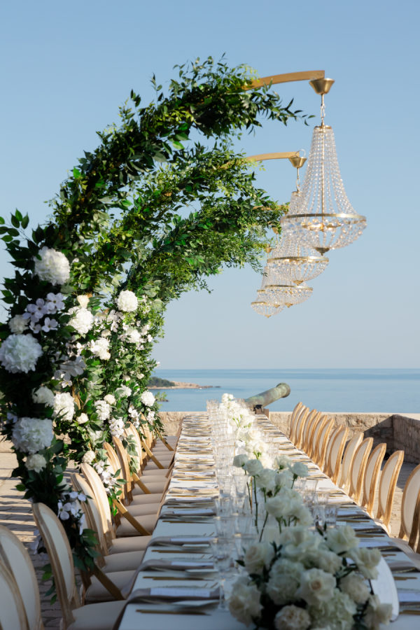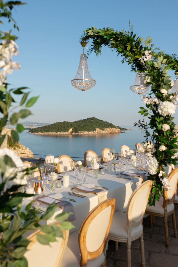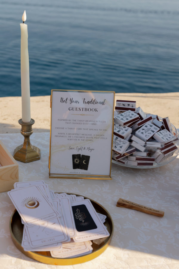 The couple’s vision centered on timeless romance with a regal touch; an atmosphere that felt both elevated and spectacular. The vibe was: Fairytale—castle walls, floral arches, champagne towers, and all around elegance with personalized touches. Fort Lovrijenac (the reception Fortress on the edge of a cliff on the Adriatic Sea) carried layers of personal meaning. Inspired by Andrew’s tarot reading in Tulum, the couple transformed tradition with a one-of-a-kind guest book made of gilded tarot cards. Guests encountered thoughtful tokens everywhere, pocket crystals, custom matchboxes, and engraved Palo Santo sticks inscribed with phrases from the ceremony, such as “All of me loves all of you” and “Hey Baby, I think I wanna marry you.” Every guest also received a heartfelt handwritten note sealed with wax, a keepsake that felt both intimate and grand. Chandeliers illuminated two sweeping banquet tables crowned by a dramatic sweetheart table. It was glamorous, idyllic, and like a modern fairytale. For Veronika and Andrew, the journey was as important as the destination. They designed their celebration as a progression across multiple settings,s inviting guests to walk through Dubrovnik’s storied walls, past arches and stonework steeped in history, before unveiling the grand reveal of the fortress. With a string quartet performing the Game of Thrones theme, the ceremony felt like stepping into another time. True to their backgrounds in film and production, every detail was planned with imagination and artistry. Veronika jokes that she had a “Canva deck for everything,” from napkin folds to chandelier heights.