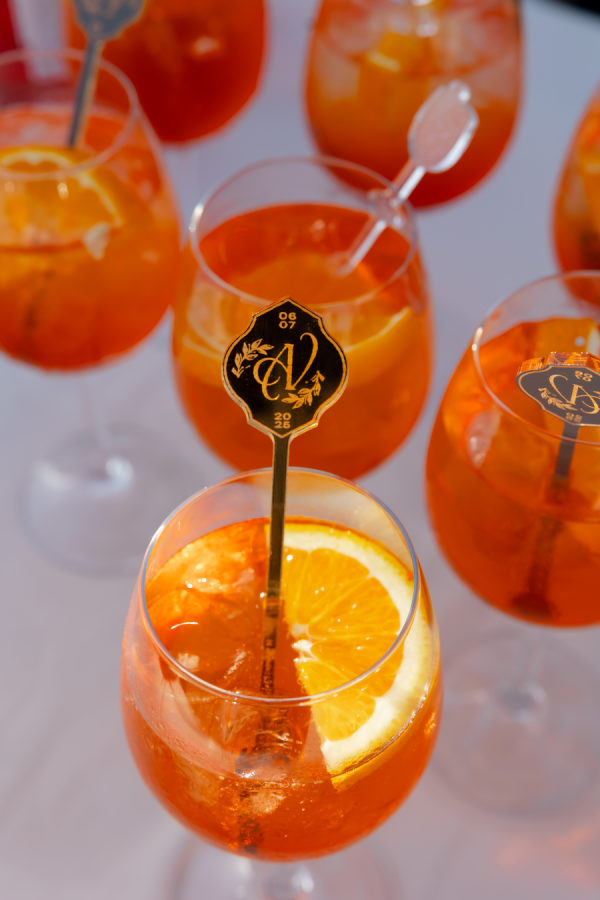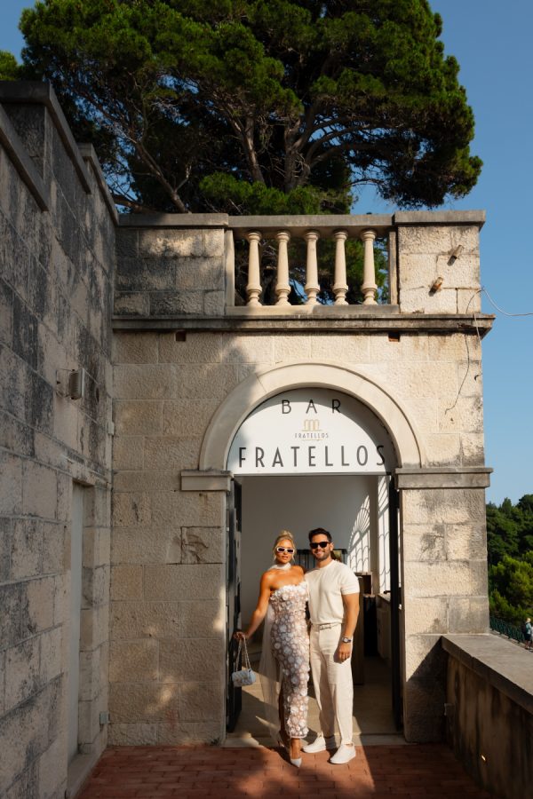 The celebration began on Friday, June 6th, with a private walking tour through Dubrovnik’s Old Town. That evening, friends and family gathered at Fratello’s Prosecco Bar on the edge of the Adriatic Sea, where the couple welcomed them with Aperol Spritzes adorned with custom #DashToTheCastle stirrers. Light bites, signature meat and cheese plates, and fresh seafood were served. For the wedding, Signature cocktails like the “Vowtini” and “Espresso Ever After” flowed until 2 am. Guests enjoy custom menus, choosing between meat, pescatarian, and vegetarian signature Croatian dishes. Startersincludee Octopus salad, Caprese salad with fresh basil, or Dalmatian smoked ham, accompanied by a selection of local cheese,h olives, driedtomatoes,s and figs. Entrees were Sea bass fillet with grilled vegetables and roasted potatoes, Chicken stuffed with panceta and mozzarella, roasted potatoes and grilled vegetables entree, or Vegetable risotto. The dessert table overflowed, as seen in the photographs; Cheesecake, chocolate cake, apple strudel, fruit, and fruit salad. Raspberry vanilla wedding cake paired with Coffee and tea. The weekend concluded on Sunday, June 8th, with a private takeover of Copacabana Beach Club. Guests sipped cocktails, jetskied across the sparkling Adriatic. Food included home-style barbecue, French fries, pizzas, salads, and vegetarian burgers. (The perfect hangover food)