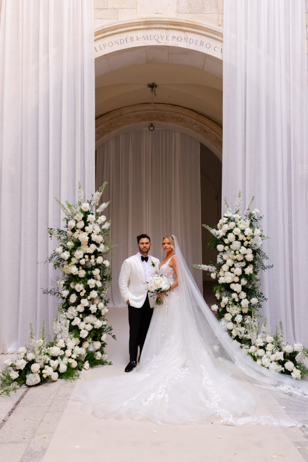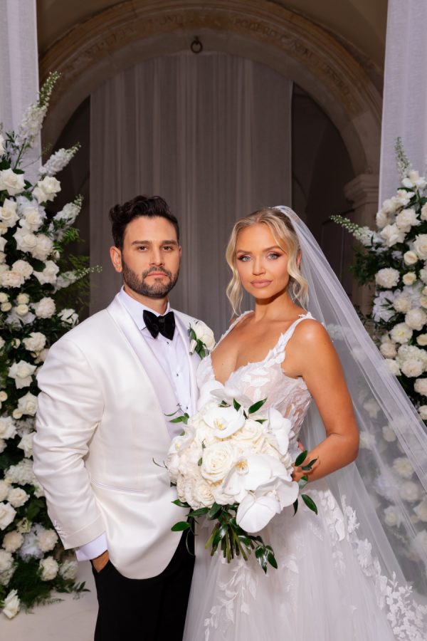 Veronika Dash and Andrew Sandler’s love story has often been compared to a romantic comedy; the two first met as students at the University of Southern California, where Veronika, an actress, producer, and model from New York, was cast in Andrew’s very first short film. From that moment, their creative paths were intertwined, and they quickly became inseparable. For more than a decade, they built a bond rooted in friendship, sharing family holidays, countless film sets, and every corner of their daily lives side by side. (Including being roommates in a condo in Hollywood with Andrews, now Best Man, and former DJ DiJital) Everything shifted during a trip to Tulum, when a tarot card reading revealed to Andrew that their connection might be destined for more. What followed was a love story that felt inevitable to everyone around them; when the pair announced their relationship, friends and followers alike reacted with delight, insisting they had seen it coming all along. One year later, Andrew proposed in Tulum on 11/11/22—a date deeply significant to Veronika, who had lost her grandfather during COVID and often saw those numbers as a sign of his presence. That same sense of destiny carried into their wedding day. During the ceremony, when their officiant and close friend Alanna Thompson spoke Veronika’s grandfather’s name, the church bells rang at that exact moment, followed by a wave of applause from the guests. It was a moment that felt both magical and fated, affirming the presence of loved ones past and present. We included a few photos since the destination and proposal was so magnificent (In the palm of a hand in the middle of the Tulum Jungle)