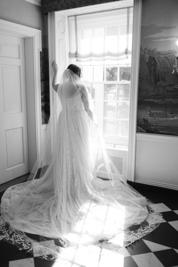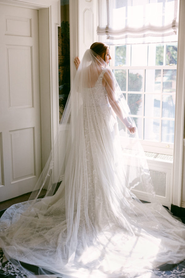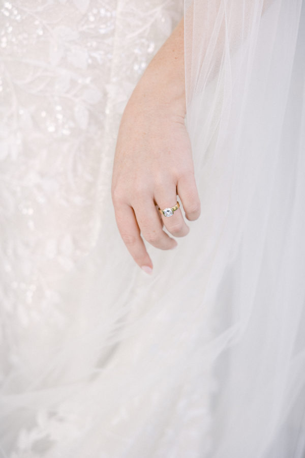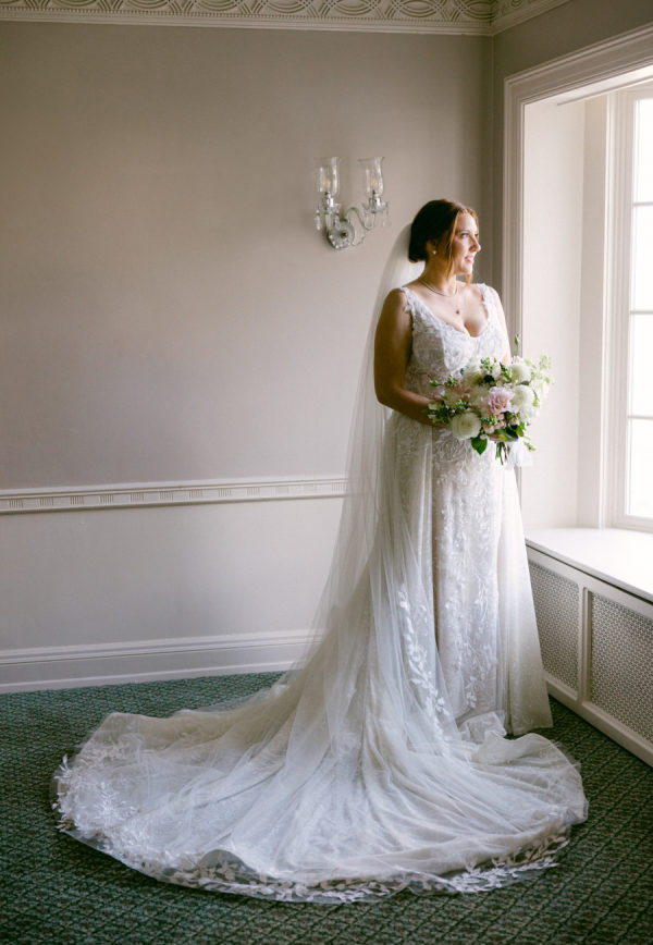 I knew from the start that I wanted a gown with an overskirt that would allow me to shift from ceremony elegance to a more streamlined reception look without a full outfit change. When I found the Wednesday dress by Wona Concept, it was an instant yes. The dramatic overskirt paired with delicate floral appliqué gave it the perfect combination of structure and romance. I purchased the gown at Bridal by J in Canandaigua. My veil was custom-designed by Ali Eagen of Made by Anatomy in Buffalo, who also handled all alterations and made the entire ensemble feel personal and special.