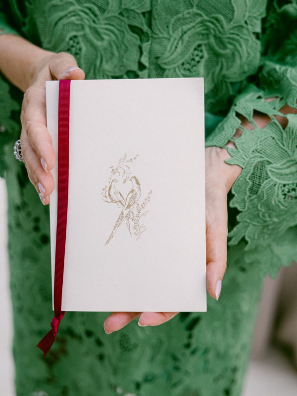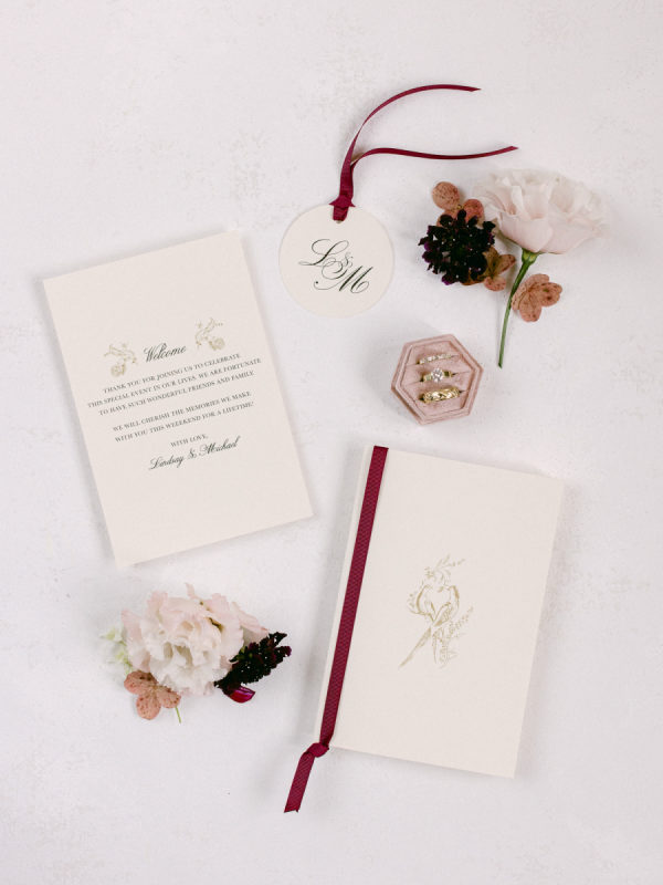 Early in the planning process, I became captivated by a botanical wallpaper at our venue featuring birds, vines, and florals. I worked with Buffalo-based pen and ink artist Karen Matchette to sketch some of my favorite elements, and we incorporated those illustrations into our invitations and day-of paper goods. It became a subtle artistic thread that tied the entire design story together.