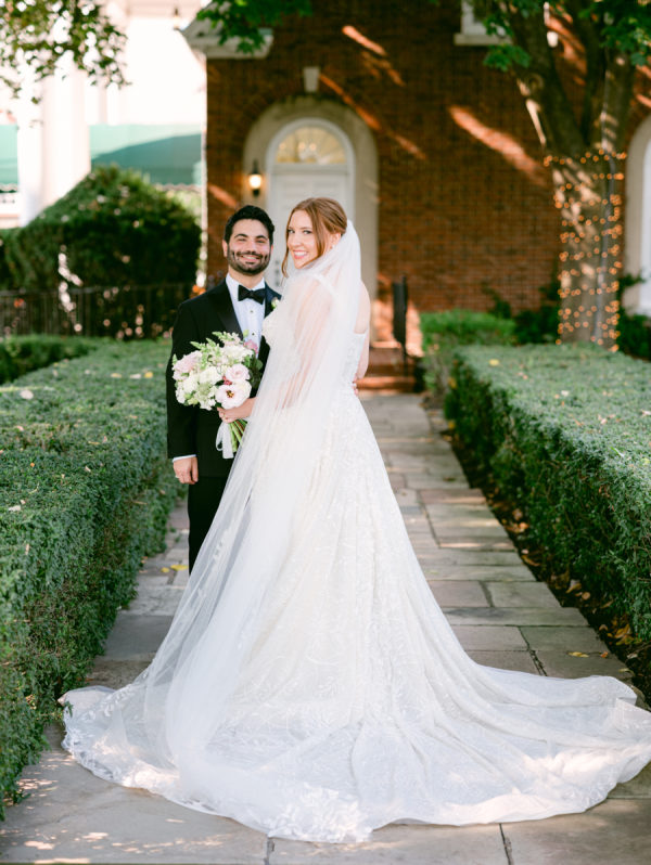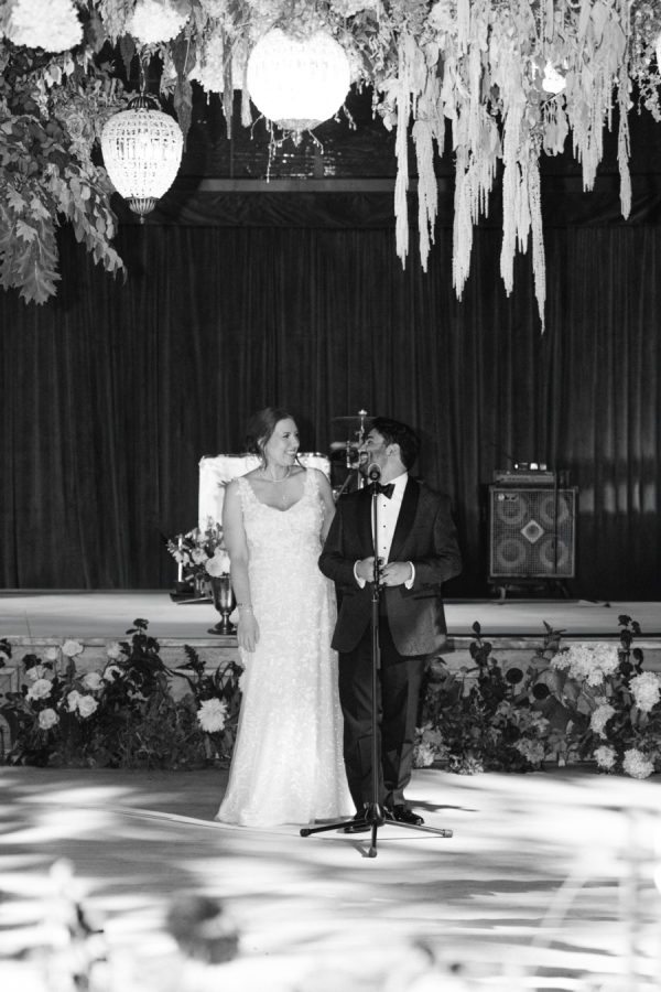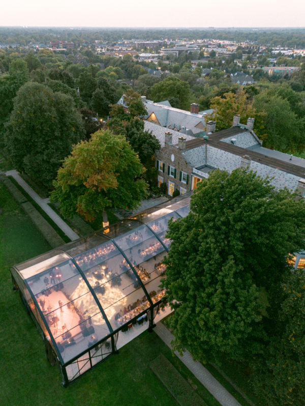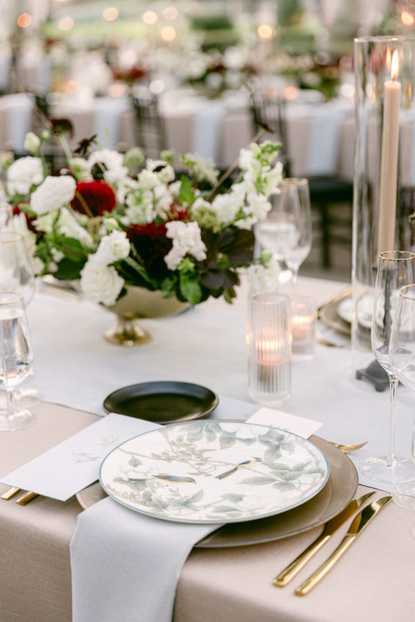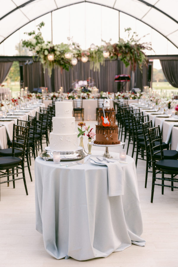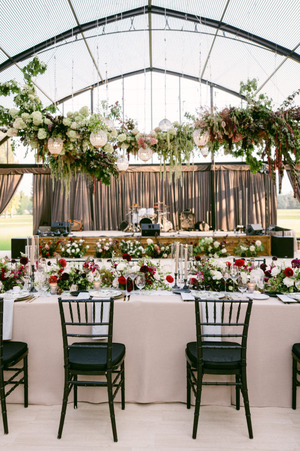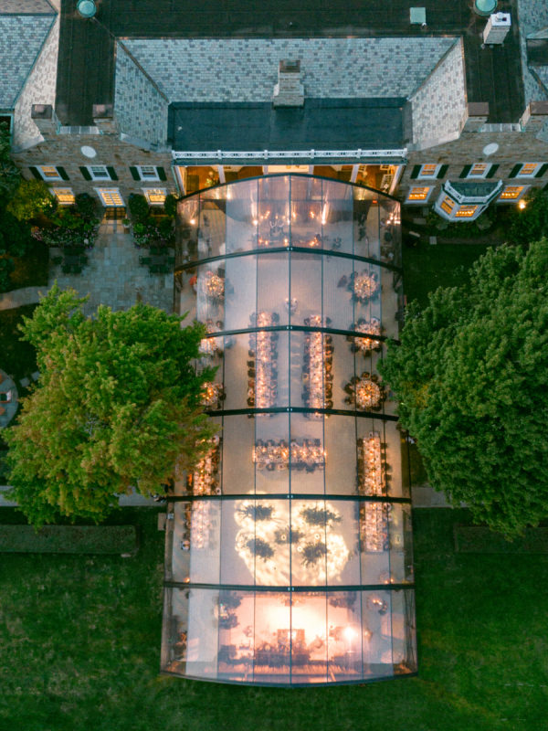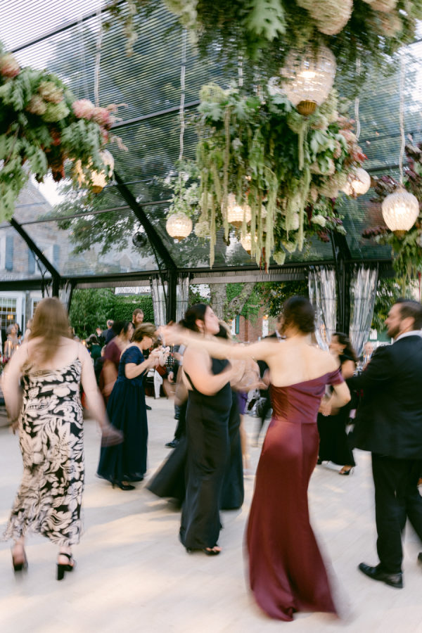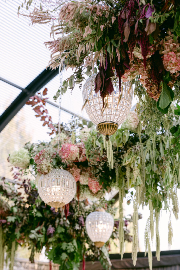 The florals and décor were truly the heart of the design. Daulton drew inspiration from the venue’s iconic wallpaper and incorporated its colors and botanical motifs throughout the entire space. The tent was transformed with lush, layered garden florals that spilled across the tables and installations, culminating in a breathtaking floral cloud suspended above the reception. Elegant pendant chandeliers, soft greens, and thoughtful accent details created a warm and inviting glow. The entire setting felt like dining inside a magical garden, and it was romantic, immersive, and completely unforgettable.