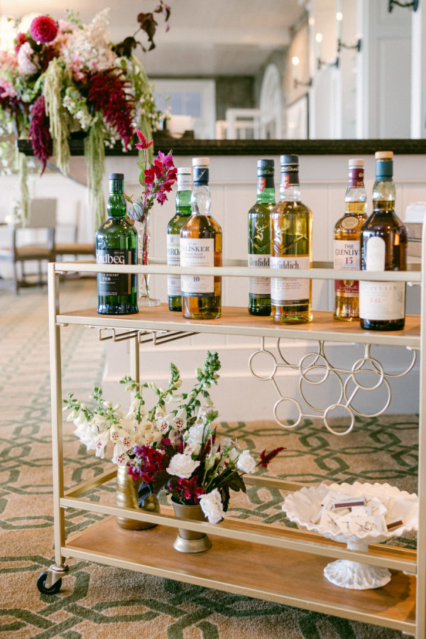 Cocktail hour featured a selection of passed hors d’oeuvres, followed by a traditional sit-down dinner with a duet entrée of filet mignon and Chilean sea bass. We wanted the dining experience to feel elevated but still deeply personal, so we incorporated meaningful touches throughout the evening. Instead of a signature drink, we offered a whisky tasting cart, which was very popular with our guests. Both of our dads enjoy whisky and helped curate the selection, and it served as a sweet nod to the years I spent studying in Scotland. In keeping with Mike’s family tradition, his mom and several cousins baked an assortment of beloved family recipe cookies. They were presented on charming two-tiered trays and became one of the most heartwarming and delicious details of the night.