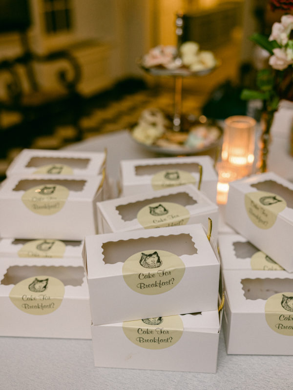 We are completely obsessed with our dog Posey, and even though she could not attend the wedding, we found several playful ways to include her throughout the day. Guests loved the koozies and drink stirrers featuring her face, but my favorite detail was the “doggie bags” used for sending guests home with extra cake. Each one was printed with Posey’s portrait, which added a sweet and personal touch.