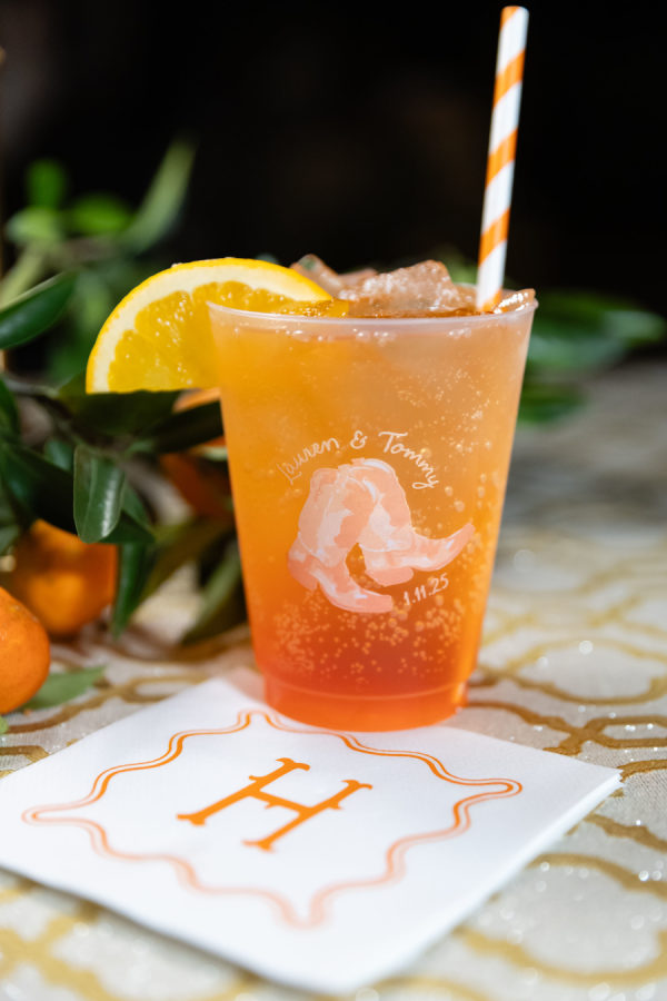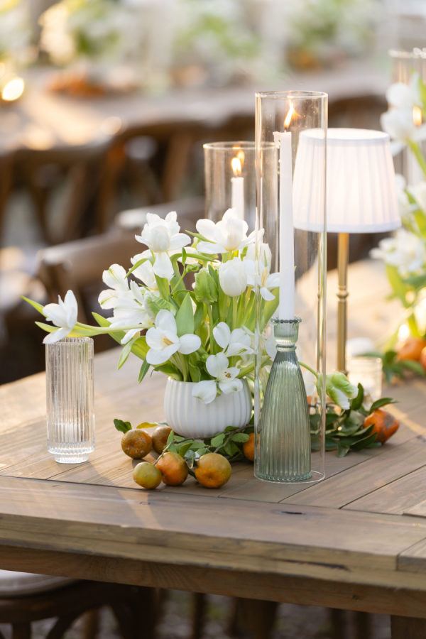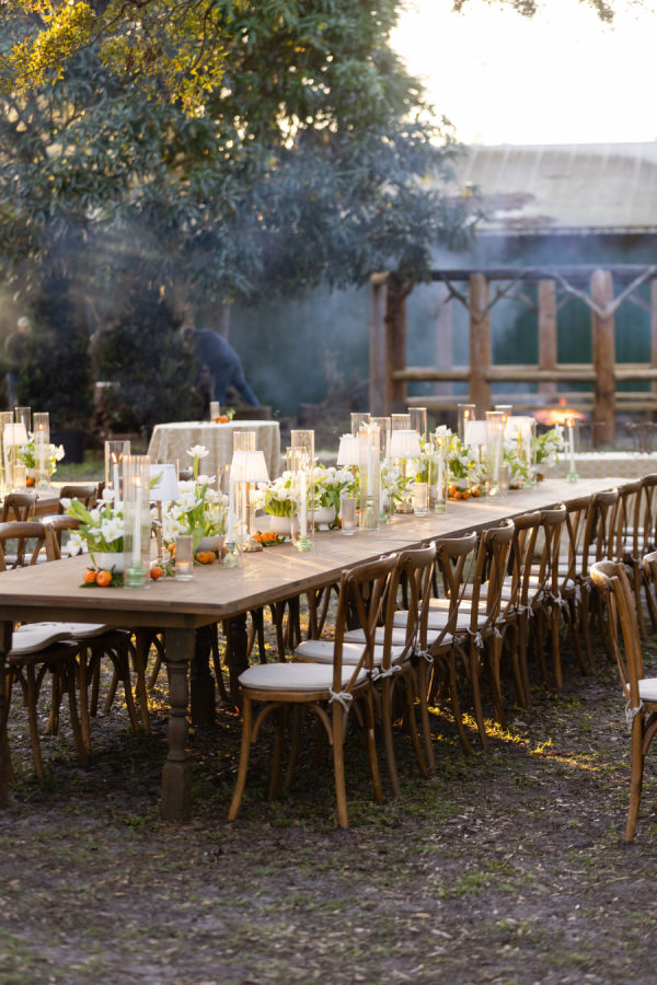 The welcome party at Hammond Grove kicked off the wedding weekend on Thursday night. Guests gathered around a cozy fire, enjoying the warm glow as they mingled with family and friends. The venue’s rustic charm, located in the groom’s family citrus grove where they had gotten engaged, was enhanced by twinkling lights hanging from the trees and stunning floral arrangements featuring vibrant oranges and lush greenery. The vision was a blend of Western farm chic, with an elevated spin on a casual bonfire. The color palette was pulled directly from the citrus grove, incorporating warm oranges, soft greens, and earthy tones. The evening was filled with delicious food and craft cocktails, including a selection of the couple’s favorite drinks. Bluegrass music filled the air, creating a lively and inviting atmosphere. The dancing began under the stars, and everyone embraced the carefree spirit of the night, celebrating the couple’s love in a place that held such sentimental value and a rich family history.