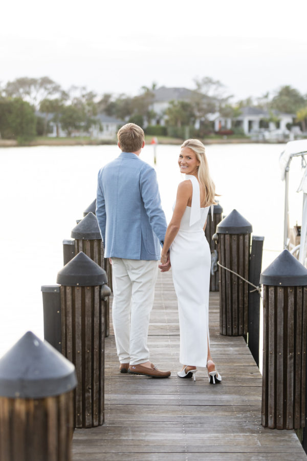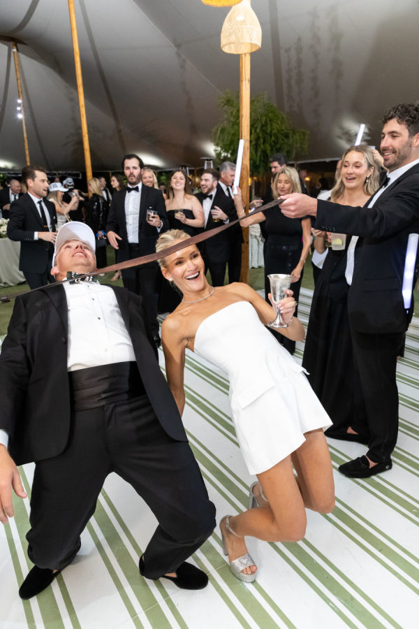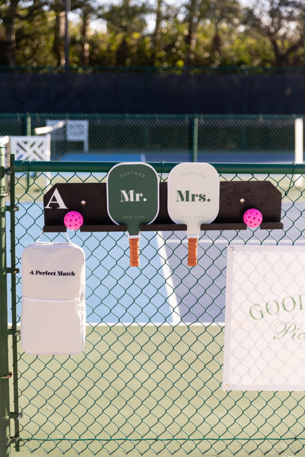 The couple started day two of their wedding weekend with a fun and casual Friday morning pickleball gathering at Johns Island in Vero Beach. Surrounded by their bridal party and family, they served up bagels and mimosas, setting the tone for a relaxed and joyful day. The vibrant pink pickleball paddles, personalized for the bride and groom as “Mr.” and “Mrs..,” added a playful touch to the event. The guests enjoyed friendly matches on the courts, showcasing their competitive spirit while also basking in the beautiful Florida sunshine. It was a perfect blend of sport and celebration, offering everyone a chance to connect and laugh.