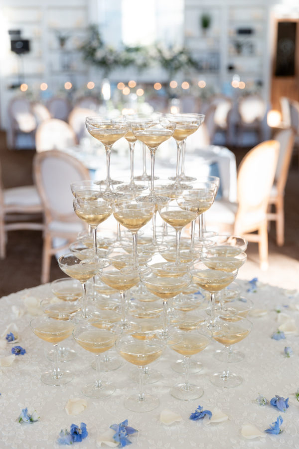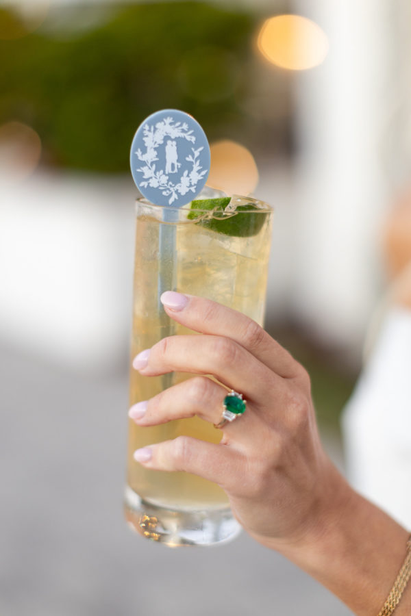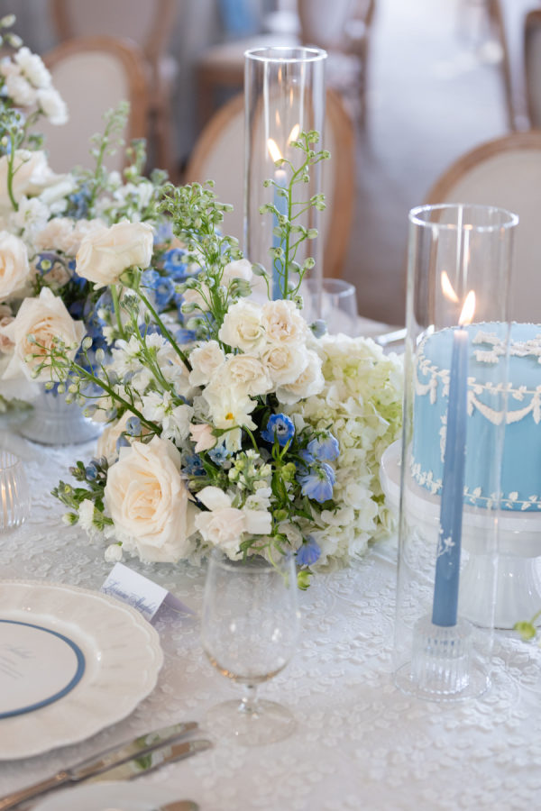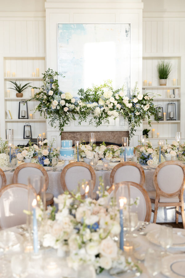 The rehearsal dinner on Friday night at the Quail Valley River Club was an elegant affair, setting the stage for the wedding festivities. Guests gathered to enjoy a chilled seafood display before sitting down to a seated dinner. Toasts and heartfelt speeches filled the air as loved ones shared their stories and wishes for the couple. The tables were decorated with stunning floral arrangements in shades of blue and white, creating a serene and sophisticated atmosphere that echoed the natural blues of the river and sky surrounding the River Club. The traditional feel of the decor, with its classic floral elements, harmonized beautifully with the serene waterfront setting. Wedgewood silhouettes were elegantly woven into the design, enhancing the timeless, sophisticated aesthetic. After the dinner, the bride and groom made their grand exit via a personalized Irish Rover, traveling to the groom’s family home for the post-toast celebration. The post-toast had an abundance of mini desserts and a creative pheasant groom’s cake, offering a playful touch to the night. Guests enjoyed beer, wine, and spicy margaritas while dancing to tunes from the DJ, socializing, and celebrating with the couple under the stars. The entire evening captured the perfect blend of elegance and fun, setting a joyful tone for the weekend ahead.