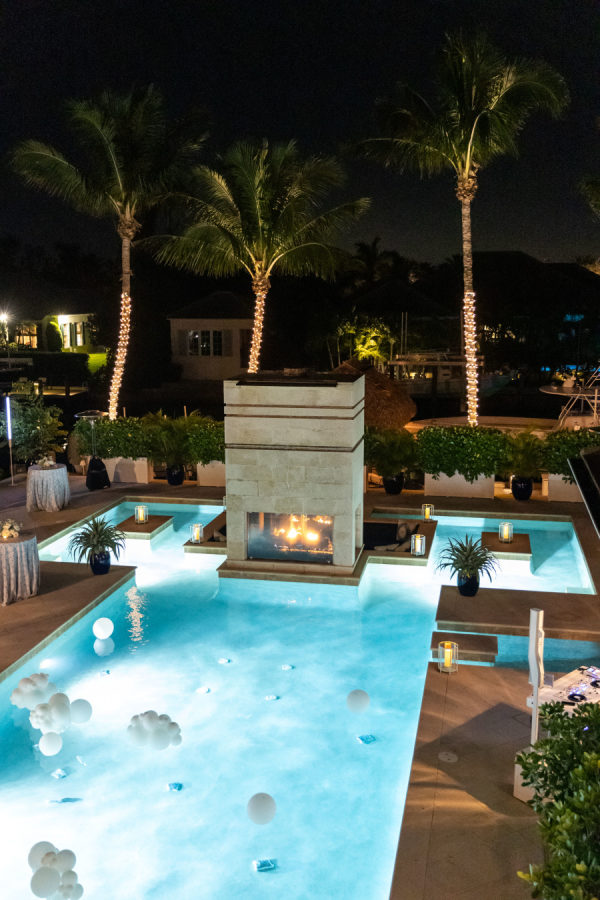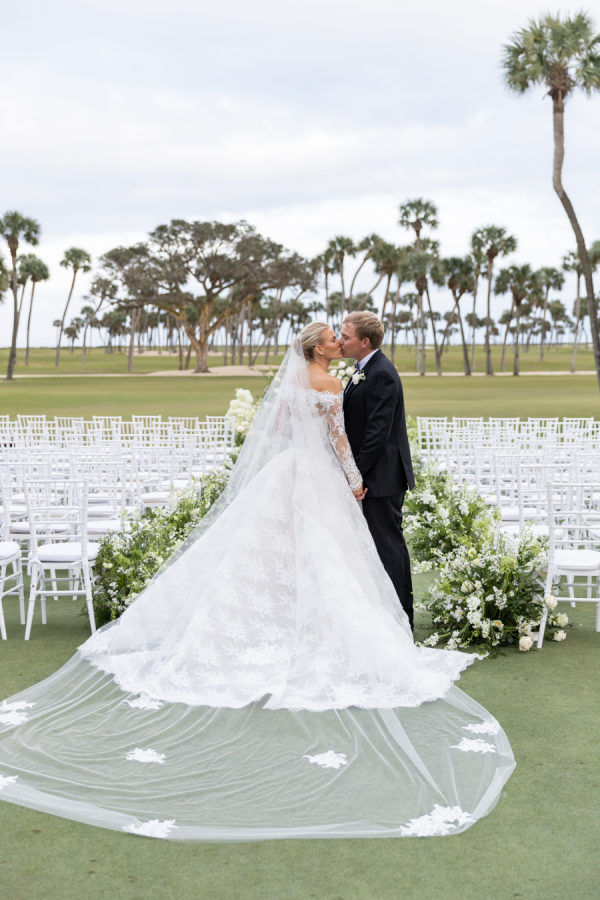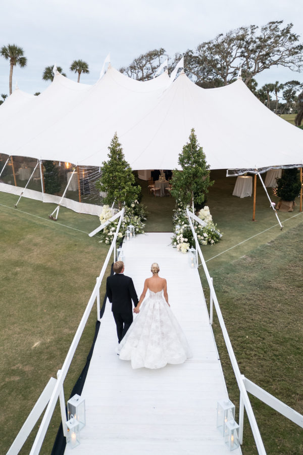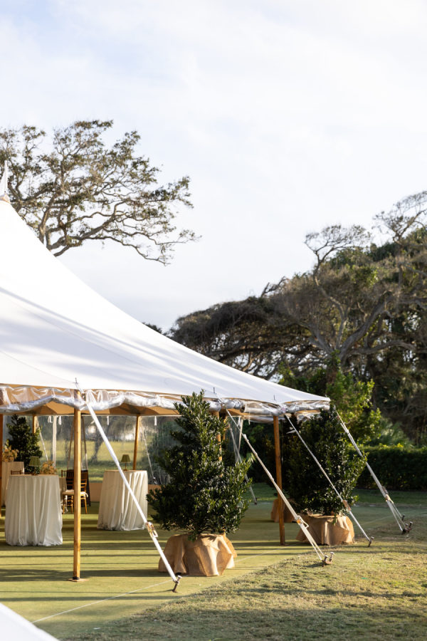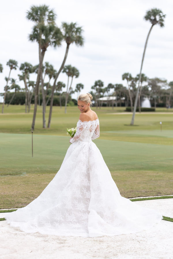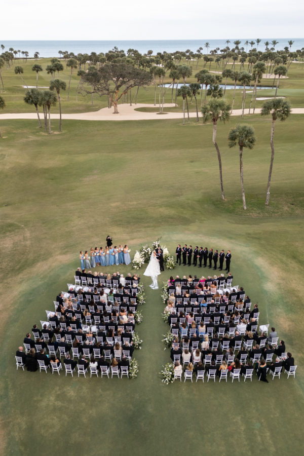 This wedding beautifully embraced its stunning setting, with each space thoughtfully designed to complement the surroundings. The vision was a seamless fusion of timeless, classic elegance with modern touches that nod to the Southern charm of the venue. The bride’s vision for originality was realized through statement pieces like the patterned inlay on the dance floor and unique wraps on the statement bar, as well as custom elements like personalized golf flags on the cocktail hour putting green. Fresh greens and sophisticated florals were thoughtfully incorporated, creating an atmosphere of opulent elegance. The overall design remains polished and refined, elevating the traditional black-tie aesthetic while allowing the natural beauty of the venue to shine through. Every detail was meticulously curated to create a playful, yet timeless celebration of love, surrounded by the perfect backdrop of palm trees and open skies.