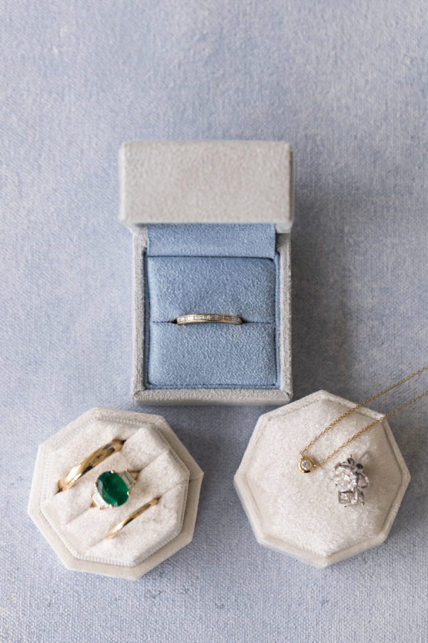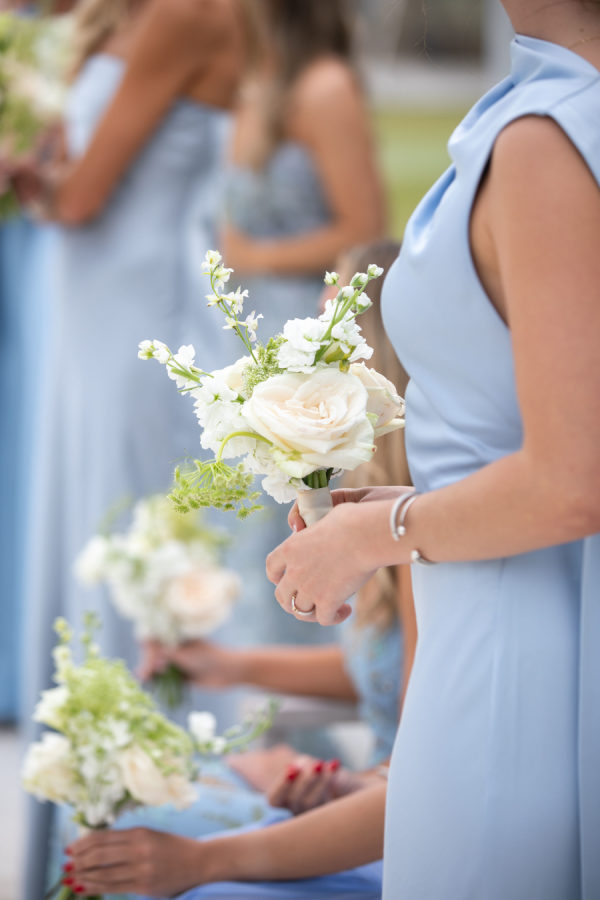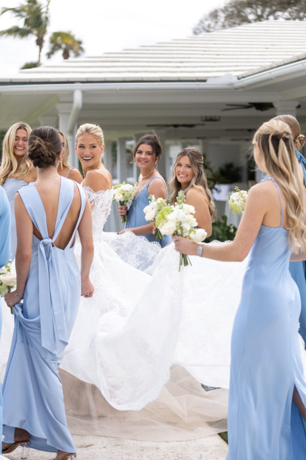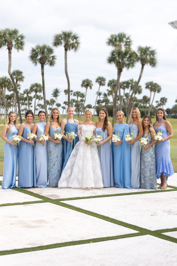 The bridesmaids’ dresses offered a fun take on “something blue.” Each bridesmaid wore a unique gown in varying shades of blue, creating a beautifully cohesive yet individualized palette. The mix of silhouettes and textures perfectly complemented the bride’s lace gown. This fashion-forward twist on tradition made the bridal party stand out, all while weaving a sentimental thread into the day’s style story. By incorporating her bridesmaids as her “something blue,” the bride honored a beloved custom in a way that felt personal, chic, and bold.