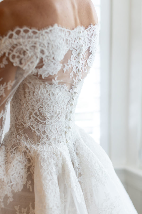 The bride’s wedding gown was a masterpiece of delicate lace and timeless elegance, by Monique Lhuillier. Featuring an off-the-shoulder neckline with intricate floral lace detailing, the dress exudes a graceful charm while the voluminous skirt cascades into a sweeping train. The gown’s detachable lace sleeves provided a graceful transition from ceremony to reception. A passionate traveler, the bride discovered this gown during a memorable trip to London, falling in love with its exquisite craftsmanship. Every element of her wedding look was a curated treasure from her adventures— this globally inspired ensemble reflects not only her love for fashion but also the journeys that shaped her story.
