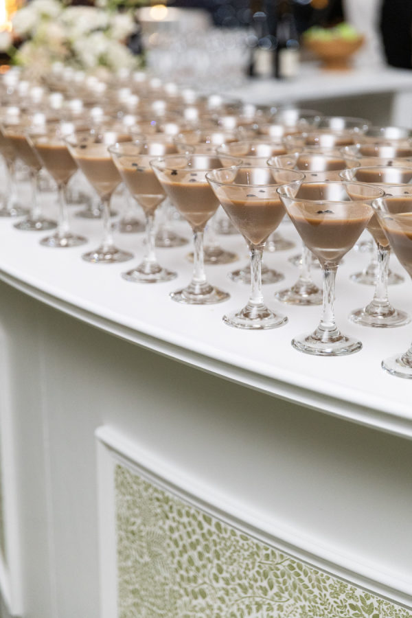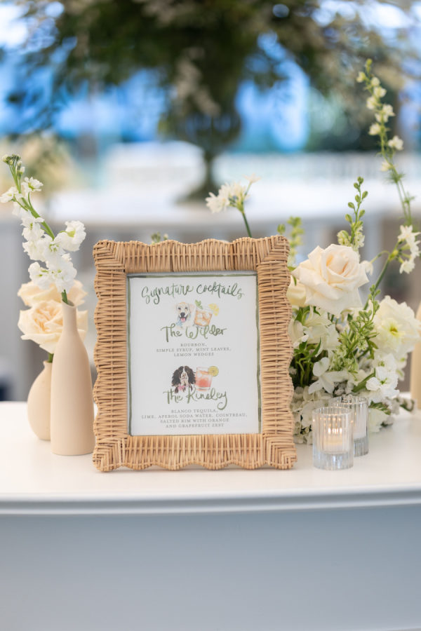 The wedding featured an exquisite culinary experience, starting with a cocktail hour on the putting green. Guests enjoyed passed appetizers, including savory stuffed mushroom caps, mozzarella and tomato bruschetta, and mini biscuits with pulled pork. The signature cocktails for the evening were an Aperol Margarita and Bourbon Smash, served alongside a full standing bar to cater to all preferences. The guests were then seated to dine on a fresh Panzanella Salad with sourdough croutons before indulging in the main course: a delicious surf and turf featuring filet mignon and lobster cake, complemented by rosemary roasted smashed potatoes and grilled vegetables. To top off the celebration, creamy Espresso Martinis were set up to grab as guests entered the reception tent during the dancing portion of the night, offering a delightful treat to keep the energy high.