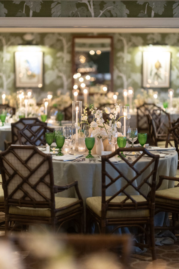 Fresh white florals like roses, peonies, and hydrangeas were paired with lush greenery, creating a romantic and natural atmosphere. The sailcloth tent for the reception added a relaxed vibe, with pendant lighting and minimalist furniture complementing the outdoor setting. Floral installations framed the aisle during the ceremony, enhancing the beauty of the golf course backdrop and sprawling palm trees. The layout and design kept the spaces distinct, while the decor tied it all together, ensuring that the wedding felt cohesive and refined from start to finish. Green glassware and patterned table linens created a lively atmosphere during dinner. The floral arrangements and wooden accents on the chargers and chairs added texture to the tables, while the overall design felt fresh and elegant, blending with the preppy country club aesthetic. From start to finish, the wedding exuded a harmonious blend of timeless beauty and modern style.
