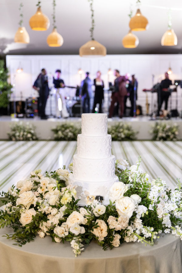 This four-tiered all-white wedding cake is delicately adorned with intricate floral piping, lattice climbing vines, and lace-inspired details. Nestled at the base, a whimsical hidden surprise features two realistic dog figurines peeking out—an endearing nod to the couple’s beloved pets. Inside, the cake was delightful with refreshing layers of coconut, key lime, and citrus, perfectly complementing the South Florida venue. Surrounded by lush arrangements of ivory and blush blooms, the cake became a showstopping centerpiece.