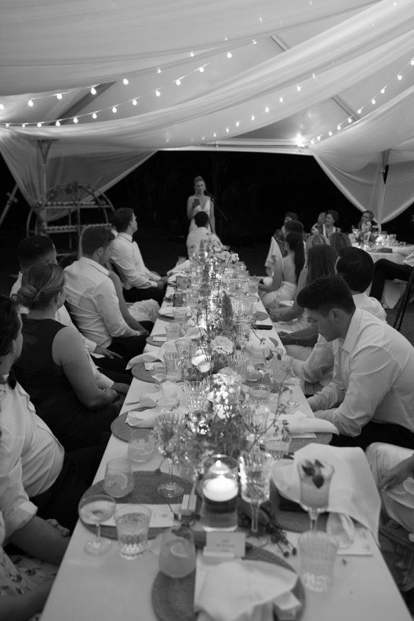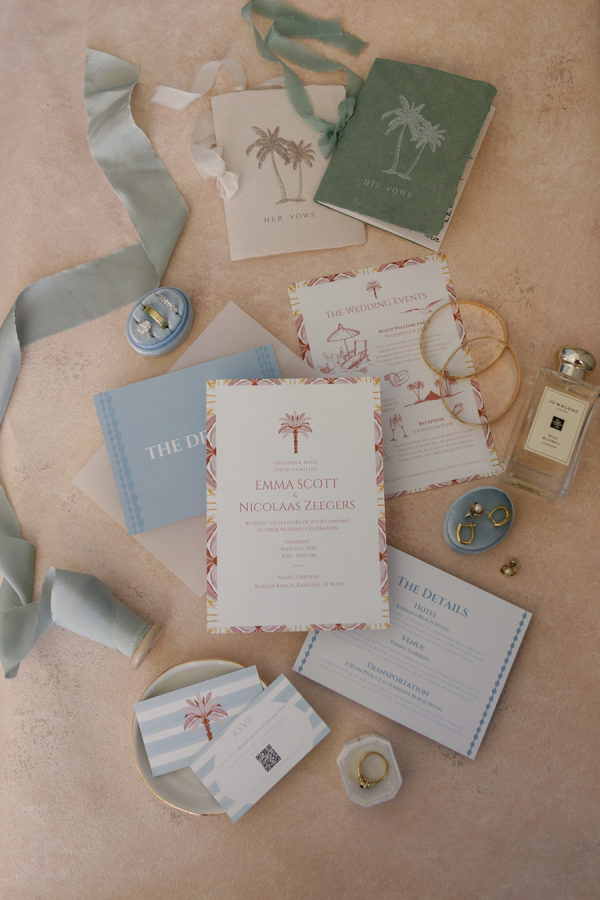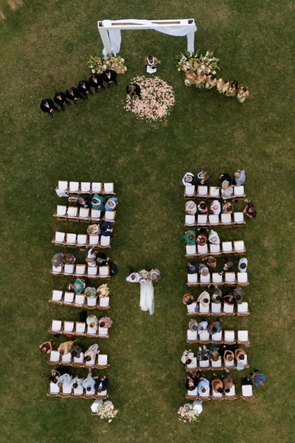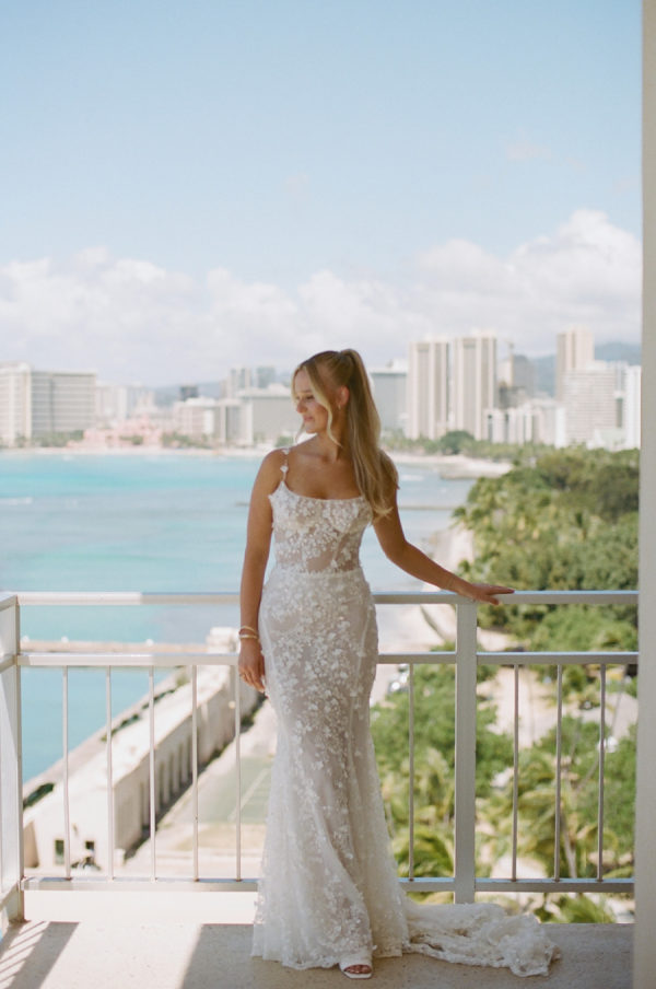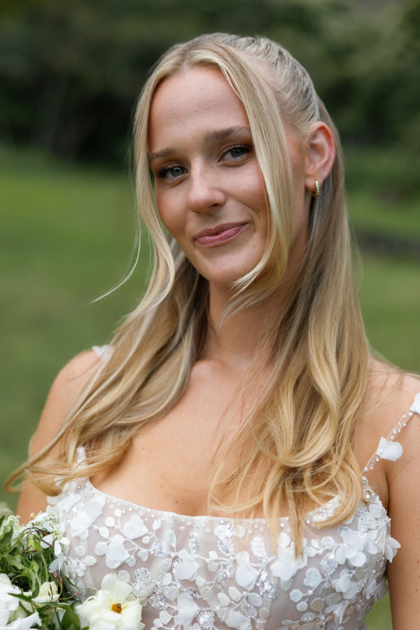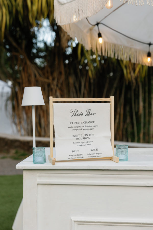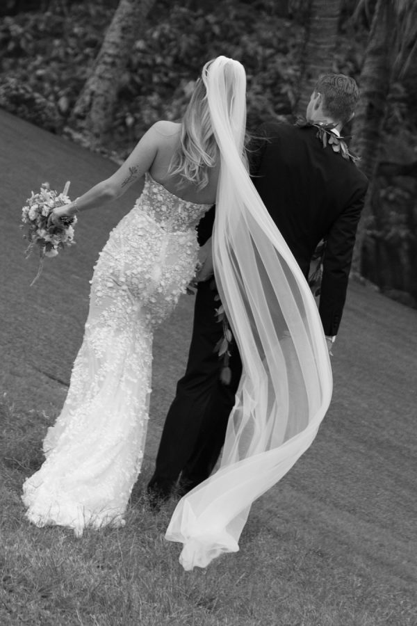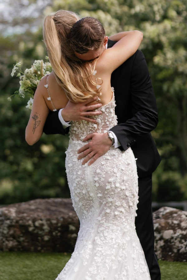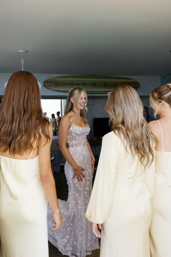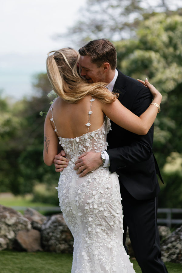 The bride wore the Catalina gown by Galia Lahav, a show-stopping design that felt effortlessly perfect for the day. With its sculptural silhouette, intricate detailing, and lightweight construction, the dress struck the perfect balance between high fashion and island ease, mirroring the refined yet relaxed spirit of her celebration. Emma shared that it was her dream gown, and she knew it was her dress the moment she put it on. Emma’s rehearsal dinner dress was from Bec + Bridge.