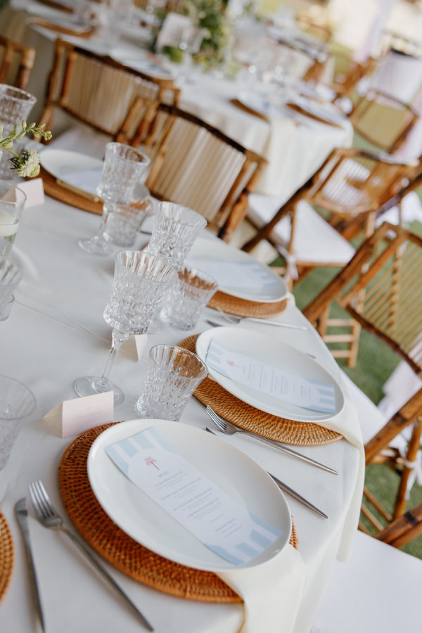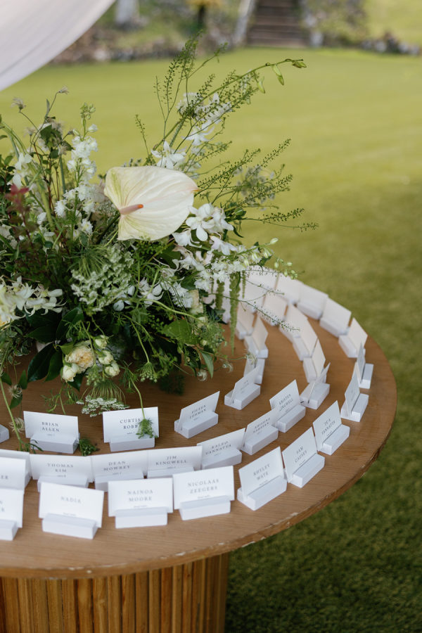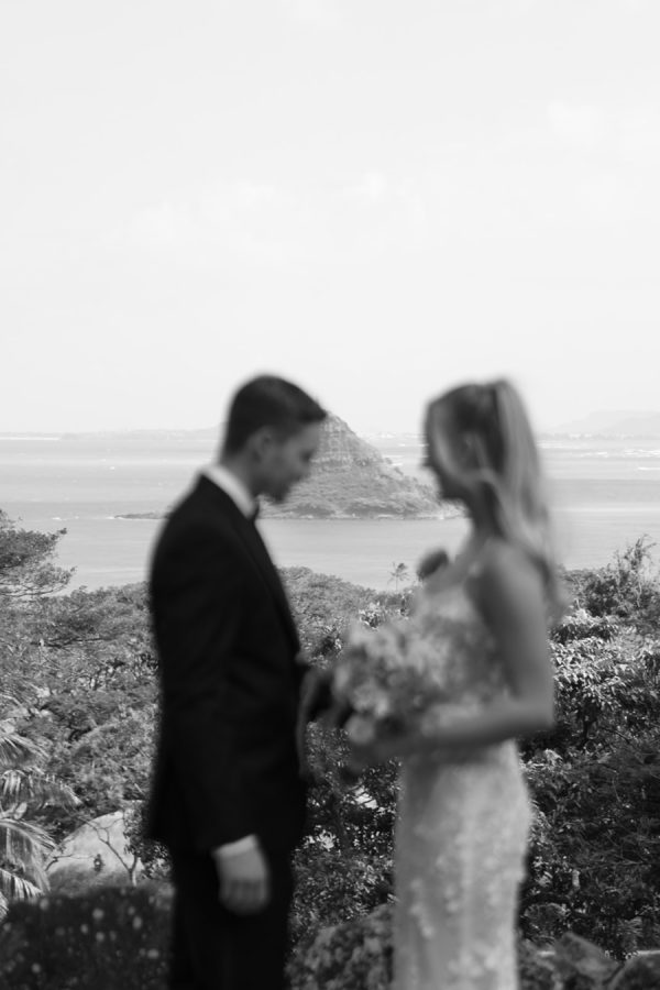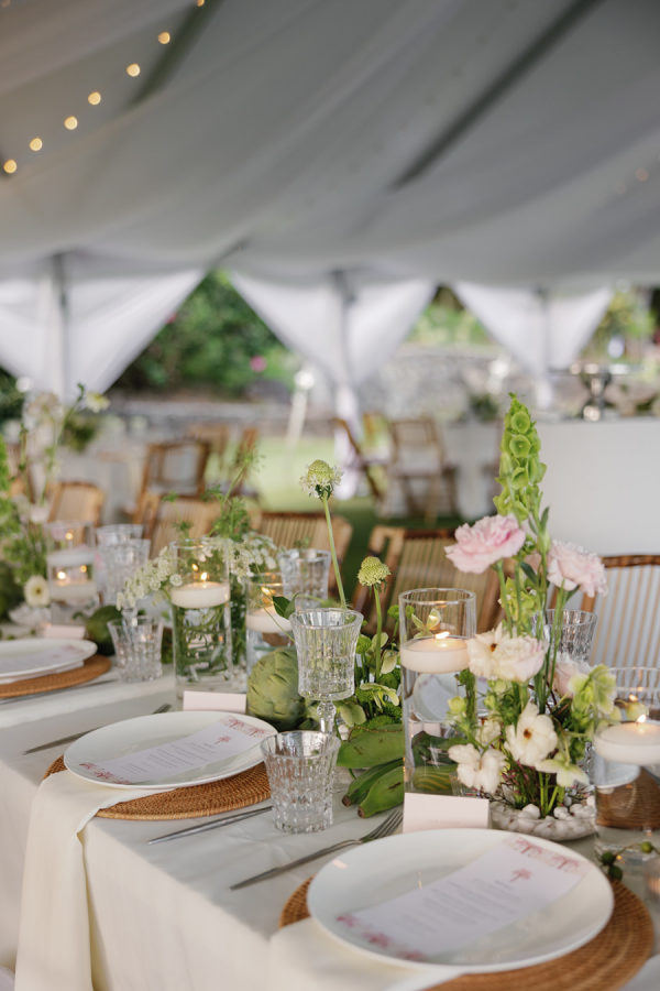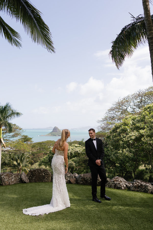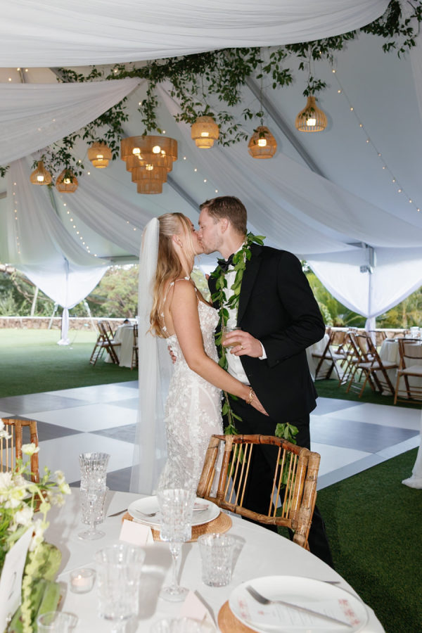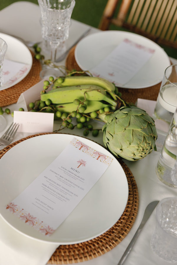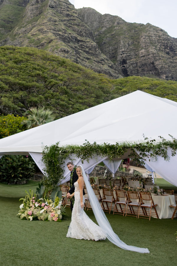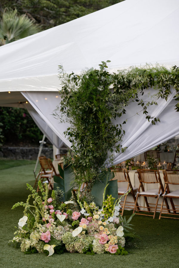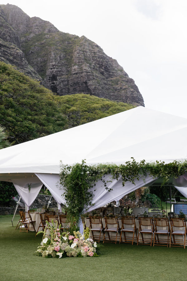Maui is where Emma is from, and Oahu is where their love story began. At a venue with views of both the Pacific Ocean and the Ko’olau mountains, Emma and Nick wanted to add to the natural tropical beauty by incorporating a whimsical, dreamy, pastel-hued garden. From the pops of tropical fruit on the tablescape, to the whimsical greenery tent entrance placement, with Chinaman’s Hat in their ceremony backdrop. Every little detail was intentionally designed.