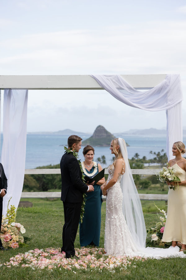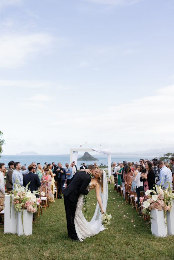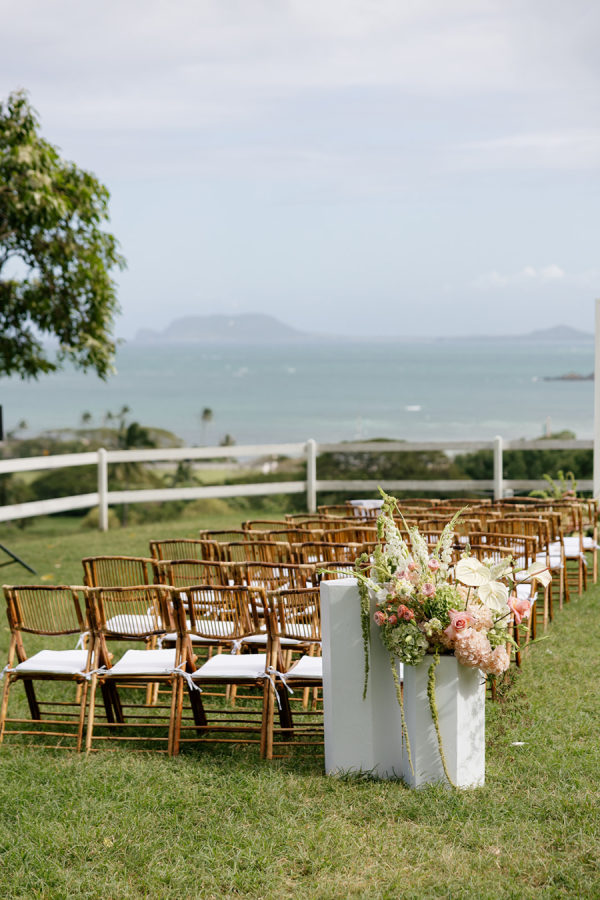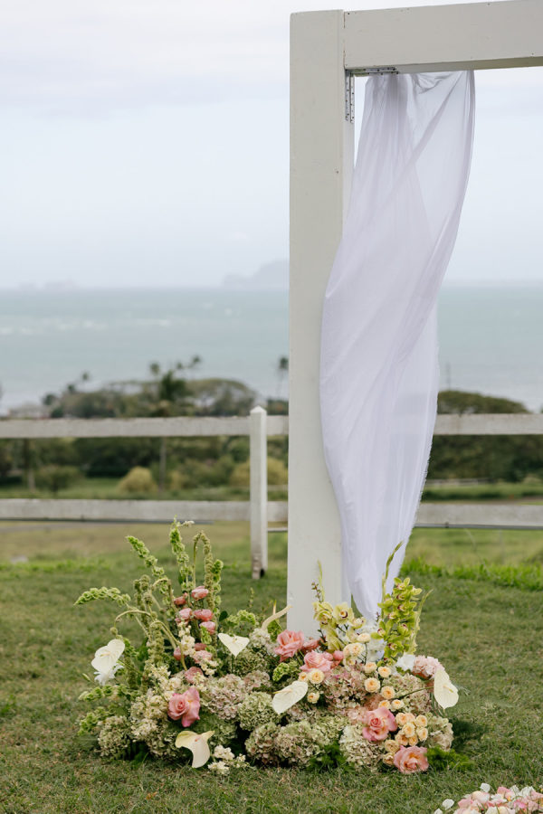 A Pastel Garden Wedding at Kualoa Ranch with Tropical Fruit Details and Oceanfront Mountain Views