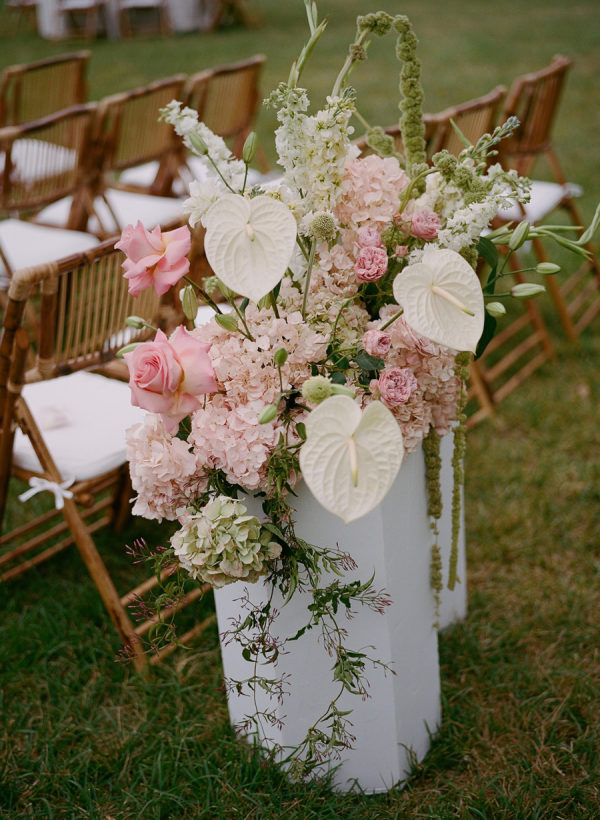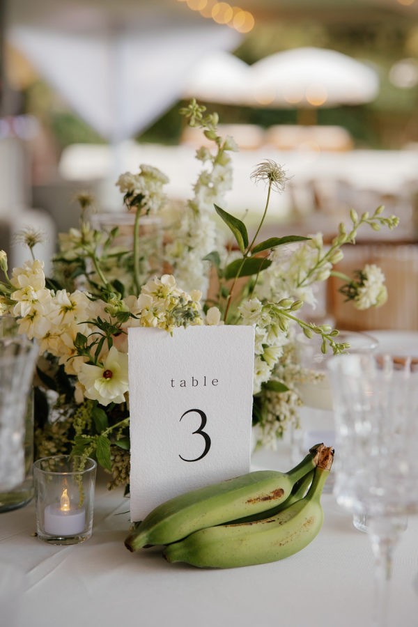 The blend between the garden spray roses, hydrangeas, butterfly ranunculuses, with the phalaenopsis orchids, amaranthus, and banana leaves created a soft, romantic Europe meets tropical Hawaii floral vibe. The soft pastel color palette elegantly added a touch of color to their design. The pop of tropical fruit organically added dimension and depth to their centerpieces.