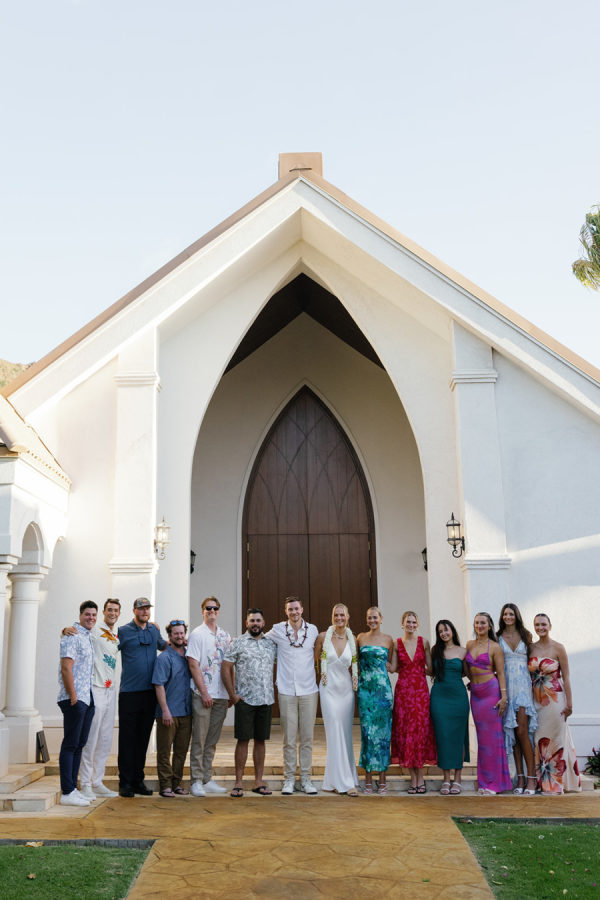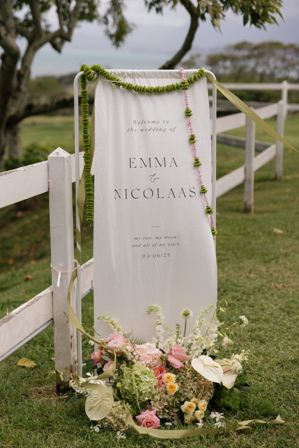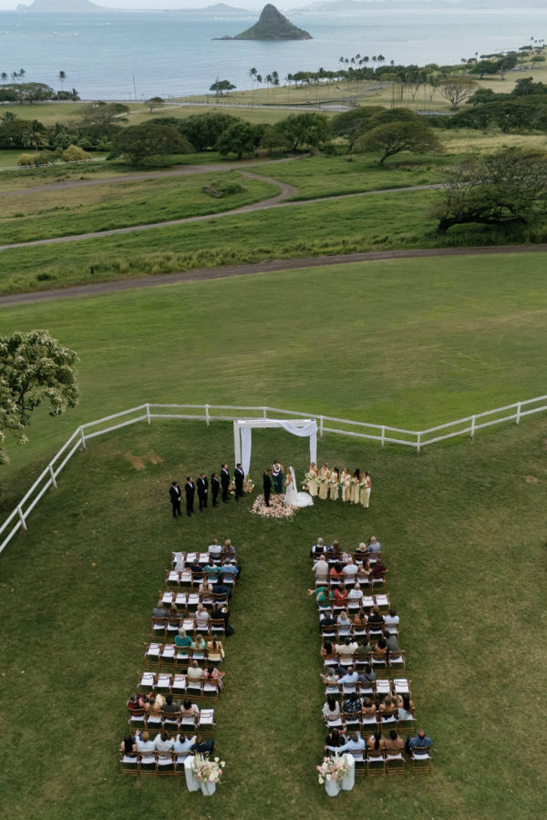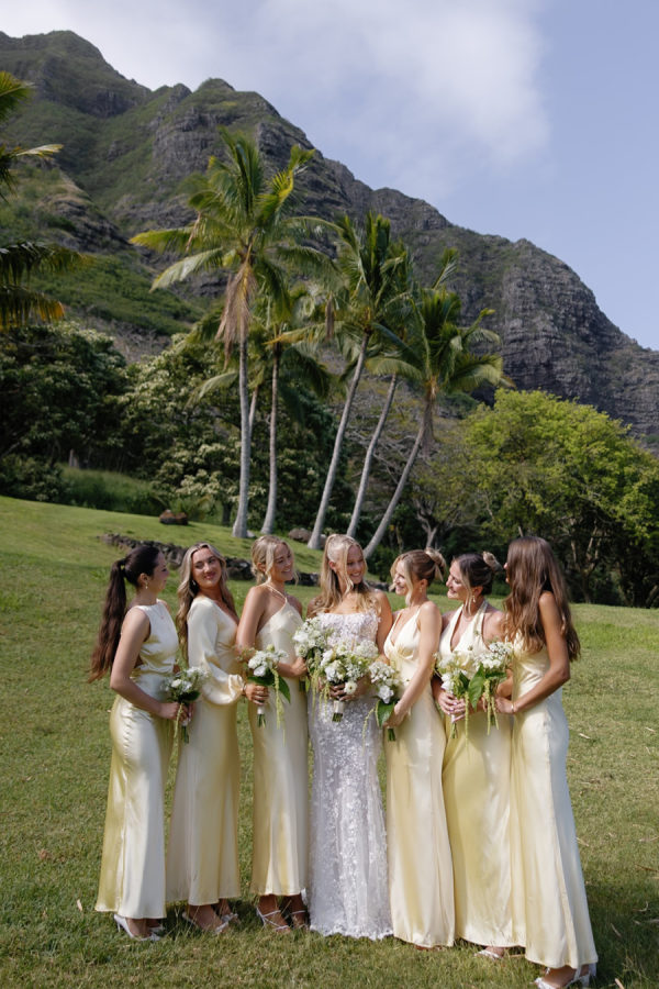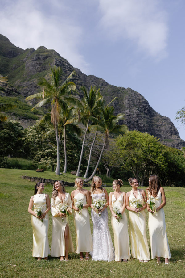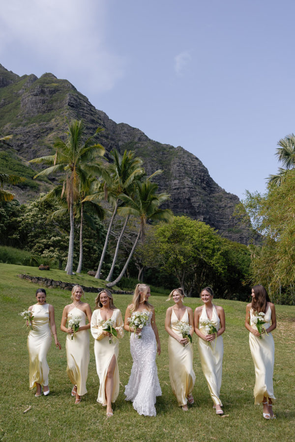 A romantic pastel-hued dream at Kualoa Ranch. Emma and Nick’s color palette included white, hues of green, pastel butter yellow, and mauve with pops of pink.