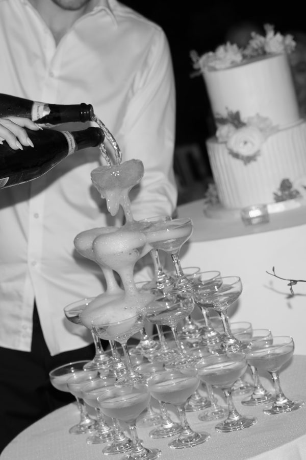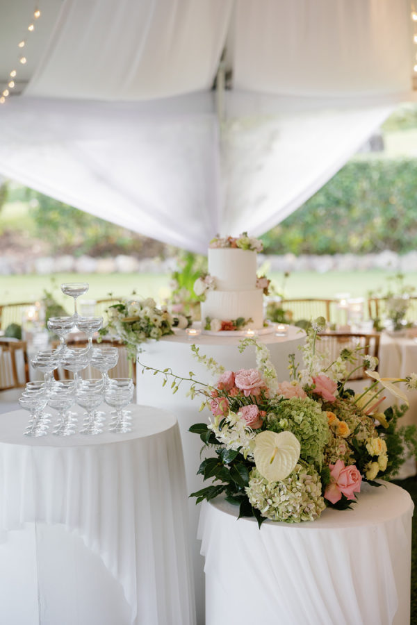 The wedding cake and champagne tower display was a statement piece. Their 2-tier yellow butter wedding cake with lilikoi cream filling and a clear coupe glass champagne tower was placed on round white pedestals surrounded by a garden of flowers. It was the perfect mix of traditional and trendy.