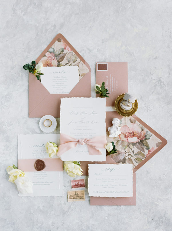 Pairing complementary colors and varying textures gives depth to a wedding design, so don’t be afraid of a variety of colors! Also, keep an eye out for what is currently trending and add touches of that into the design…we went for velvet, bows, vivid colors, and colored glassware. All if it together created a luxurious and romantic design with a bit of a modern feel. Florals set the tone for your celebration, so don’t be afraid to go big and bold!