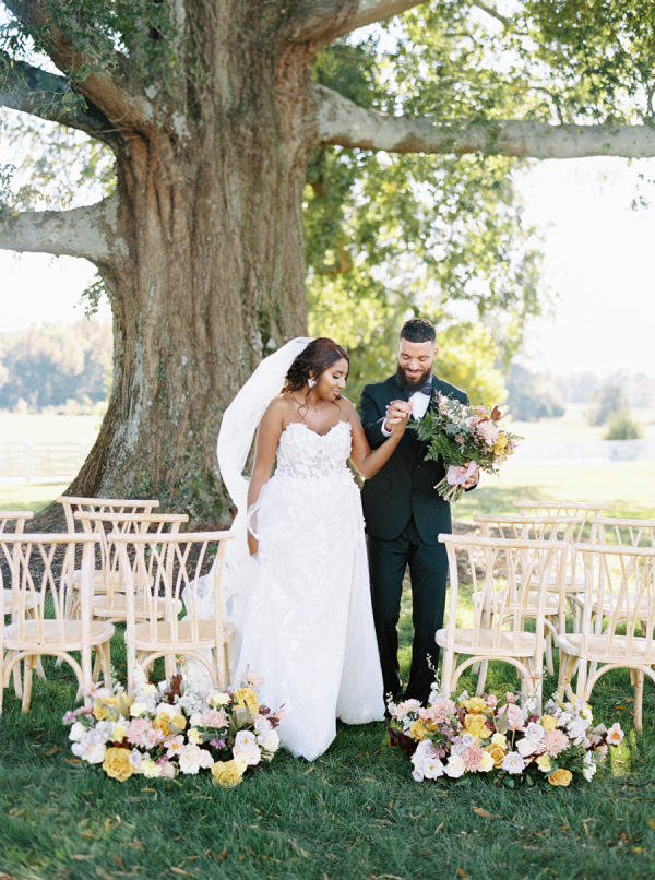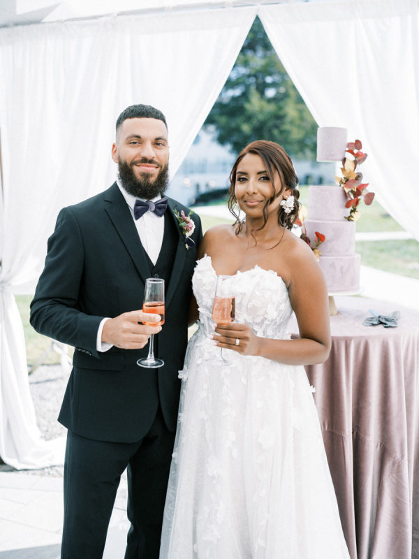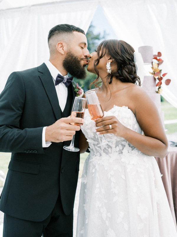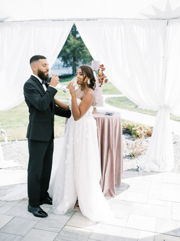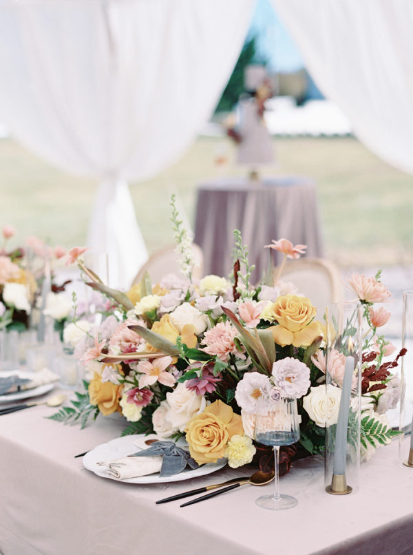 We wanted to fully embrace the colors of the season with this editorial. Dripping with florals and enhanced by soft velvet, this elevated wedding design brought October romance to life with a quiet ceremony under the big willow tree and a reception underneath Northfield’s sailcloth tent ending with cake and champagne. Brides are embracing color this wedding season, and this editorial inspires with a varied color palette that stays true to the season and luxurious style.