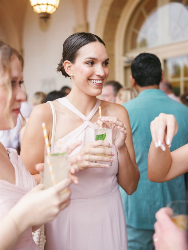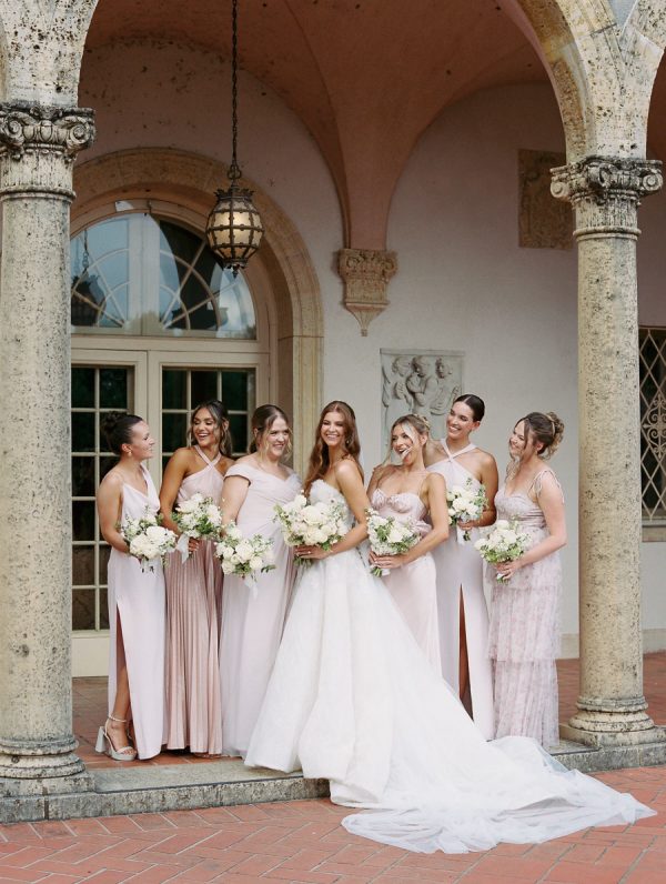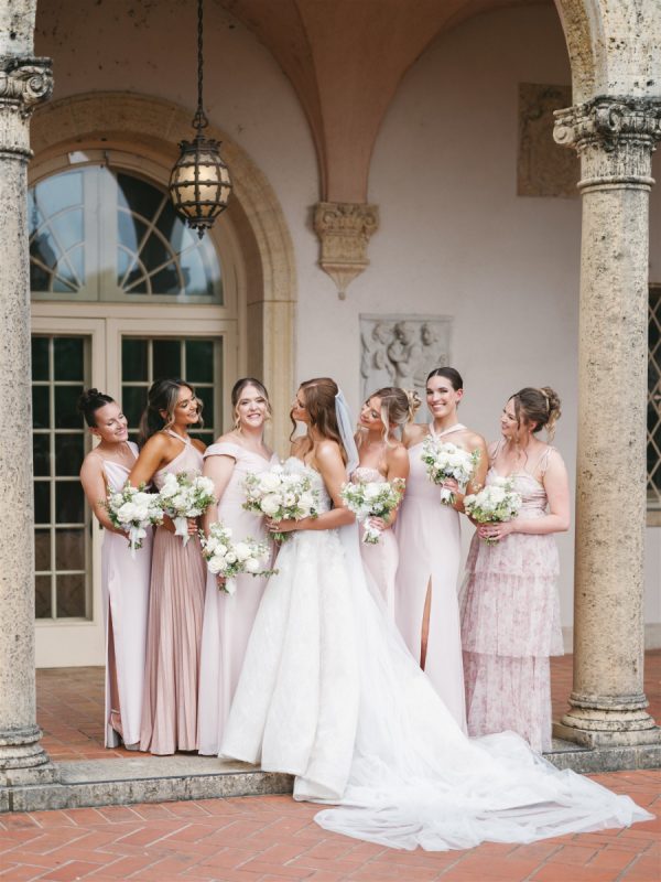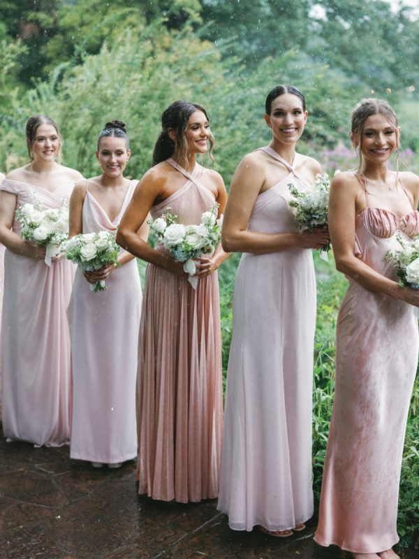 The bridesmaids wore sweet, mismatched blush pink bridesmaids’ dresses. They mixed satin, floral print, and chiffon fabrics.