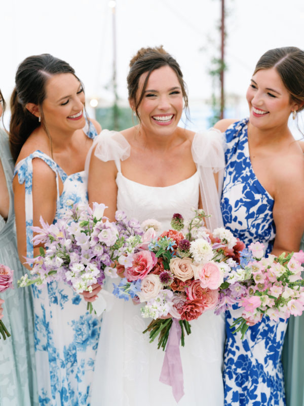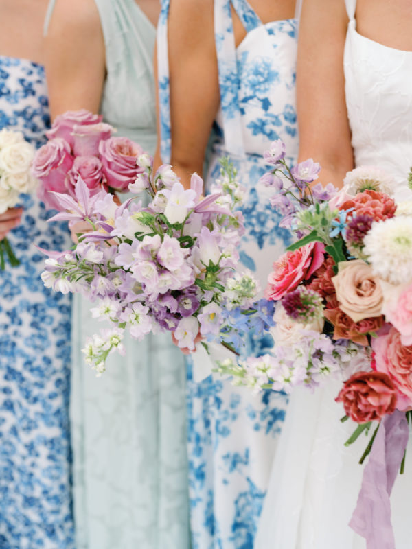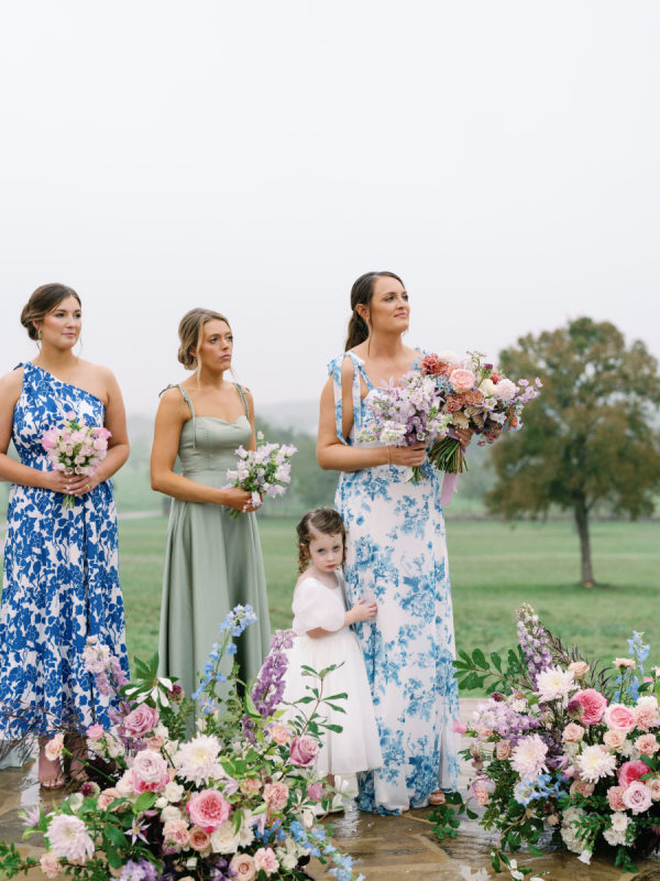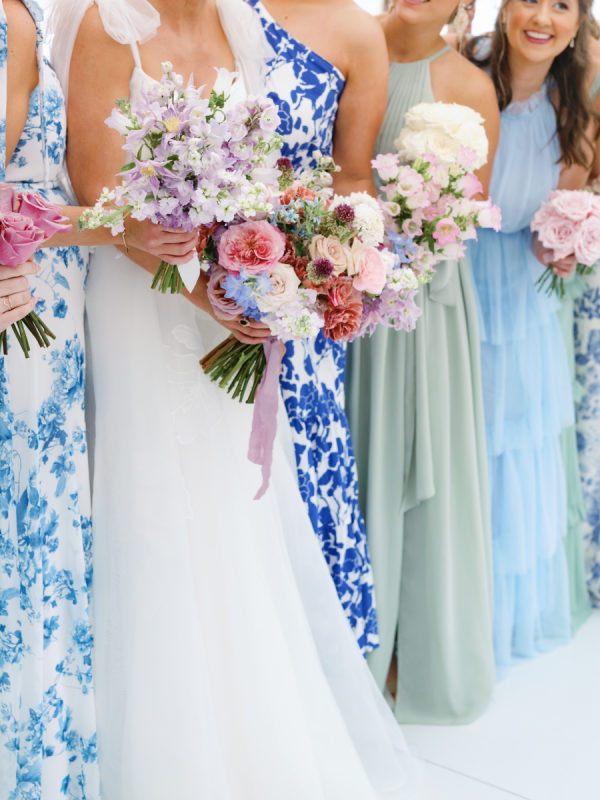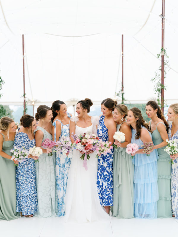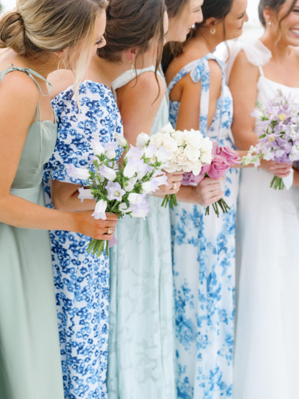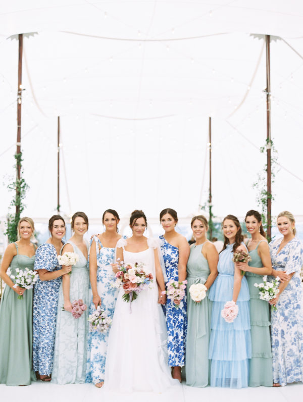 A big part of Ashlen’s design vision was having her bridesmaids in various colors and patterns, all in various hues of green and blue. While mismatched dresses have become a wedding design staple in the past few years, we love that the approach for this wedding placed a larger emphasis on pattern and didn’t shy away from more vibrant colors. The result was perfectly curated and full of personality.