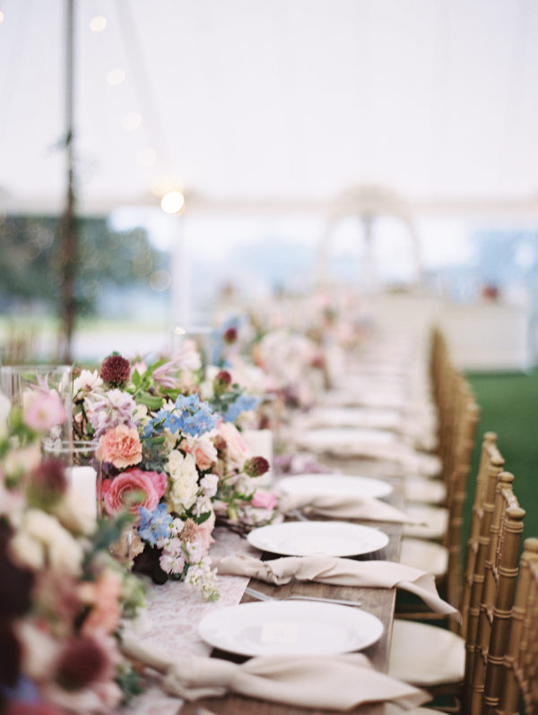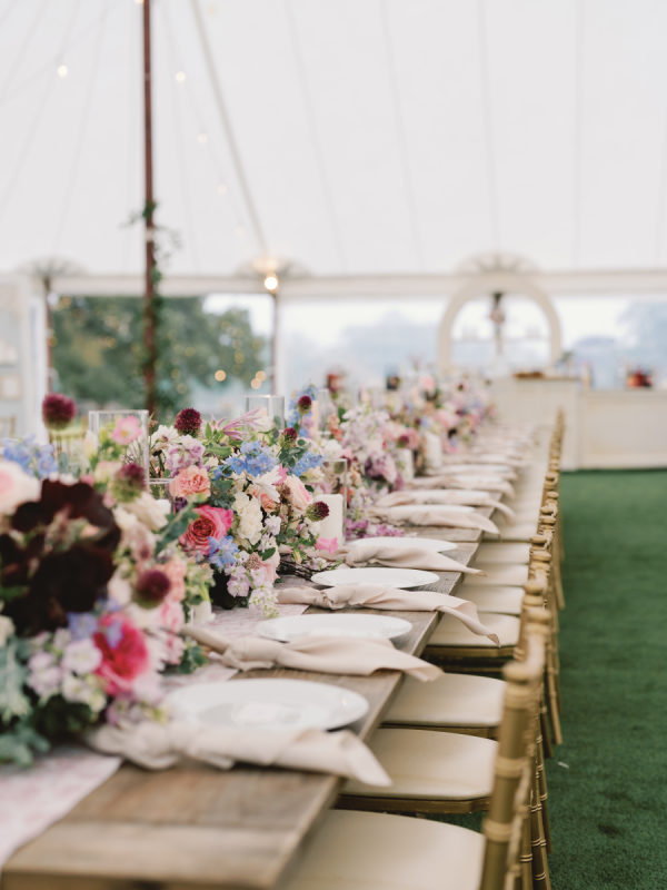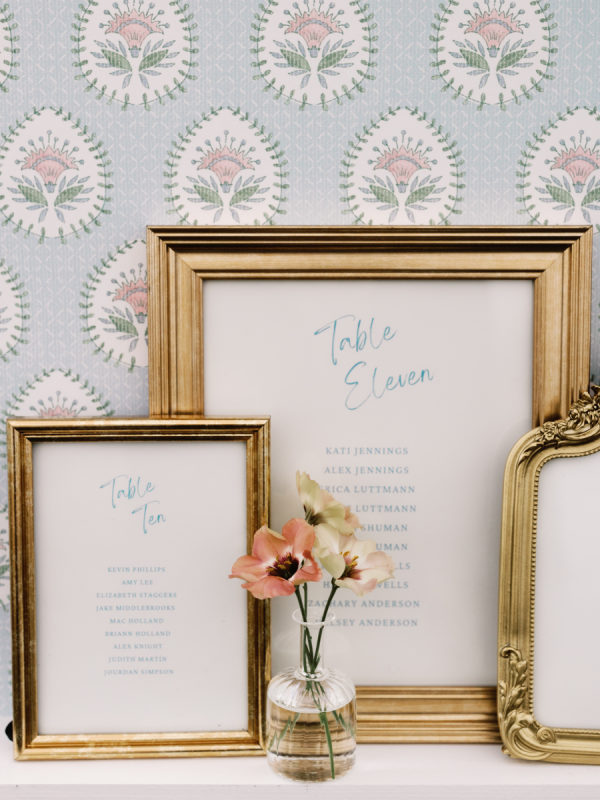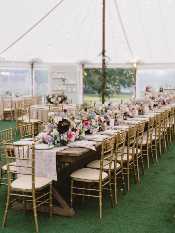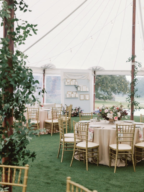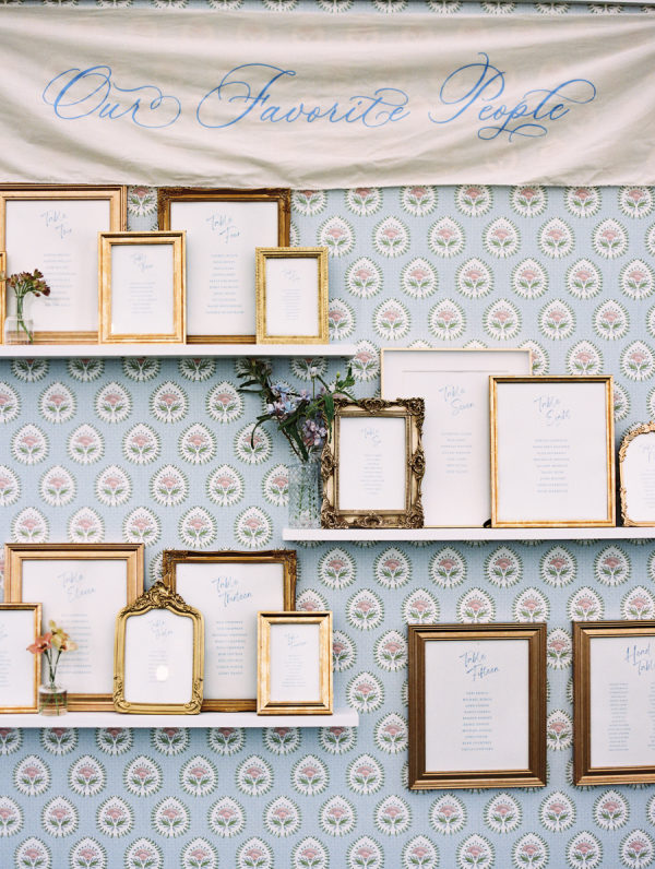 The fall color palette was on full display between the lush florals by Rose & Rae Design, the linens from BBJ La Tavola, the mismatched bridesmaids’ dresses, and the paper goods and signage done in a calligraphy style. With the emphasis on the garden-style florals, we knew all of the other design elements needed to align with and highlight the florals without overpowering them or being too plain. When sourcing the linens, we wanted them to read “neutral” but with warmth and pattern. So we selected muted latte and cameo (like a muted blush) linens for the round tables and selected a large-scale floral patterned napkin that had pink and light teal tones. On the farmhouse table, cocktail highboy tables, and cake table, we opted for a muted pink patterned runner, which differed from the napkin selection but complemented it perfectly. All of this added warmth to the tent and highlighted the floral tones that were placed on top of it. As for the tent design, we featured the head table running the length of the tent, which was adorned with lush floral meadows and candles. Round tables were placed symmetrically surrounding it, with the bar on one side of the tent and the band and dance floor on the other. When guests entered the space, they were greeted with the couple’s seating chart — a collection of mismatched frames on a wallpapered backdrop. All of this was accentuated by calligraphy-style paper goods with a vibrant blue accent color.