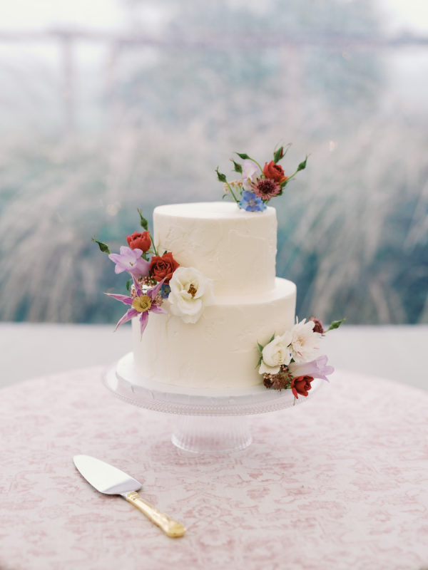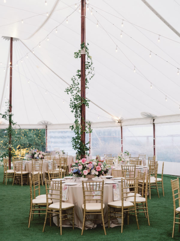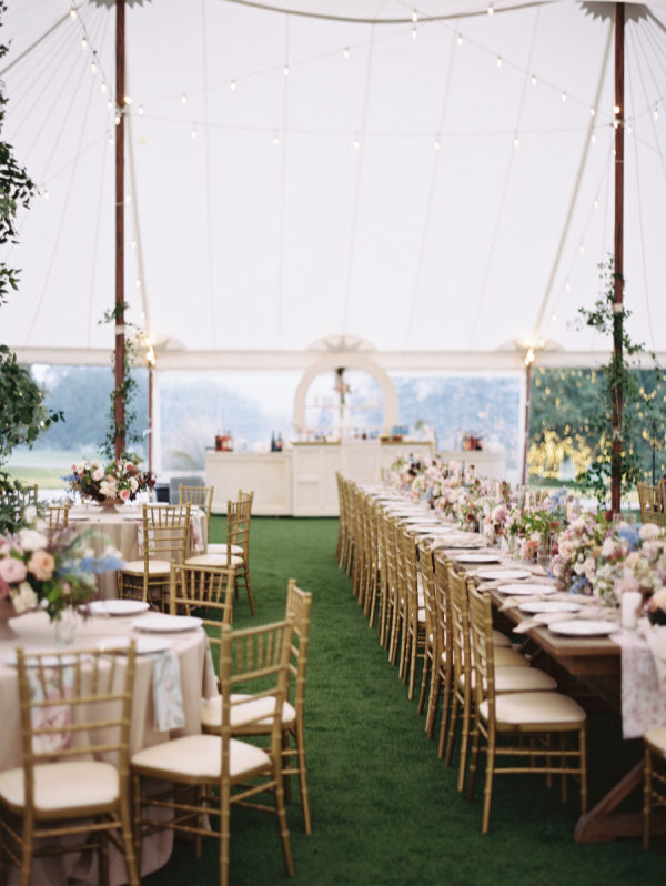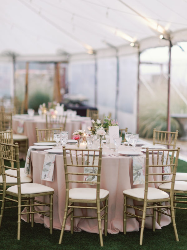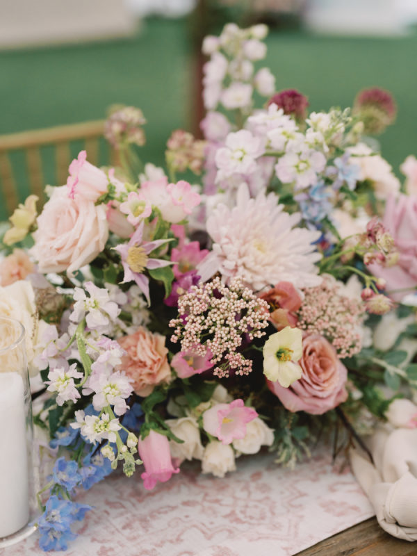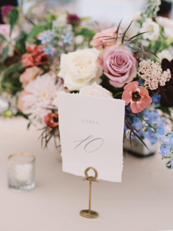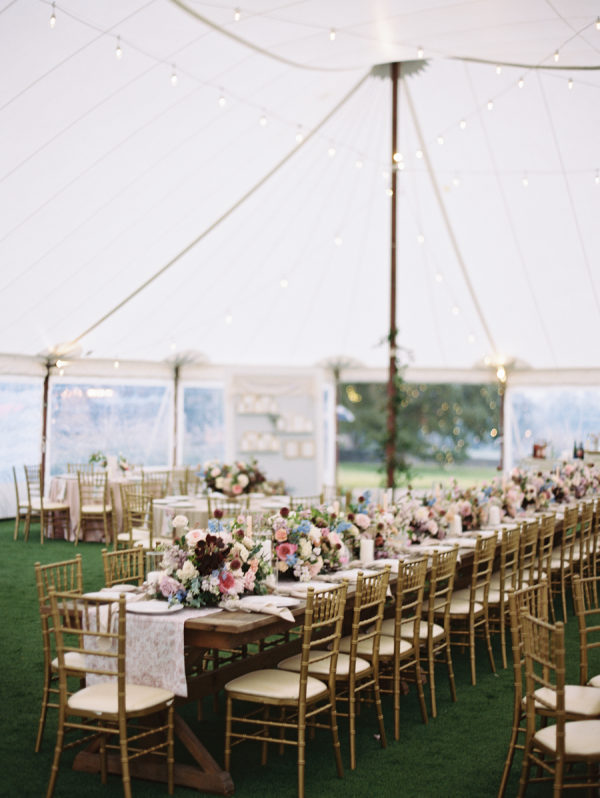 The fall color palette was on full display between the lush florals by Rose & Rae Design, the linens from BBJ La Tavola, the mismatched bridesmaids’ dresses, and the paper goods and signage done in a calligraphy style. With the emphasis on the garden-style florals, we knew all of the other design elements needed to align with and highlight the florals without overpowering them or being too plain. When sourcing the linens, we wanted them to read “neutral” but with warmth and pattern. So we selected muted latte and cameo (like a muted blush) linens for the round tables and selected a large-scale floral patterned napkin that had pink and light teal tones. On the farmhouse table, cocktail highboy tables, and cake table, we opted for a muted pink patterned runner, which differed from the napkin selection but complemented it perfectly. All of this added warmth to the tent and highlighted the floral tones that were placed on top of it. As for the tent design, we featured the head table running the length of the tent, which was adorned with lush floral meadows and candles. Round tables were placed symmetrically surrounding it, with the bar on one side of the tent and the band and dance floor on the other. When guests entered the space, they were greeted with the couple’s seating chart — a collection of mismatched frames on a wallpapered backdrop. All of this was accentuated by calligraphy-style paper goods with a vibrant blue accent color.