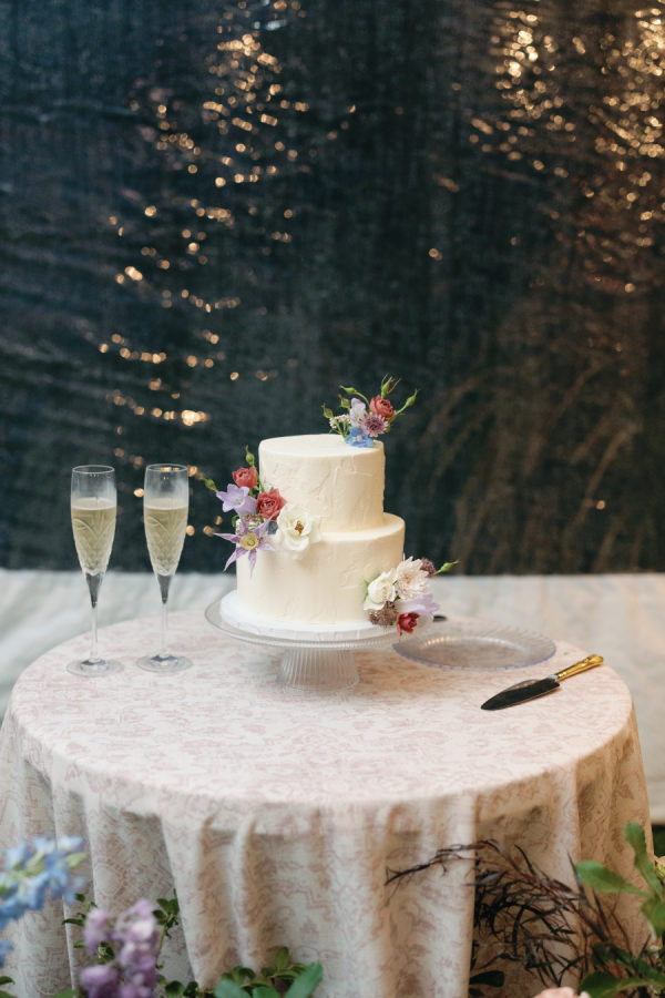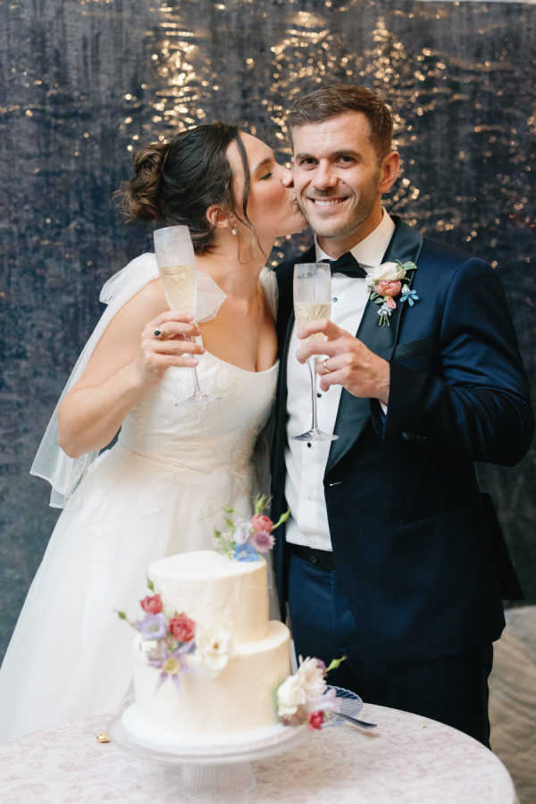 The bride and groom had a small dairy-free and gluten-free cake for cutting, which was surrounded by lush florals. For their guests, they had a decked-out candy bar, which was a nod to the groom’s sweet tooth. Jars were filled with everything from Swedish fish to sour patch kids, and more. Guests could grab a bag and take their loot of candy to go.