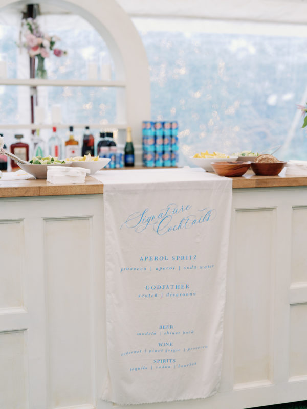 For this hill country wedding, the bride and groom served a Tex-Mex feast for their guests. Fajitas and chips, and queso filled the plates, and the margaritas were flowing. Alongside that were two featured signature cocktails — an Aperol Spritz and a Godfather. The drinks were garnished with a drink stirrer of their dog and served alongside custom cocktail napkins.