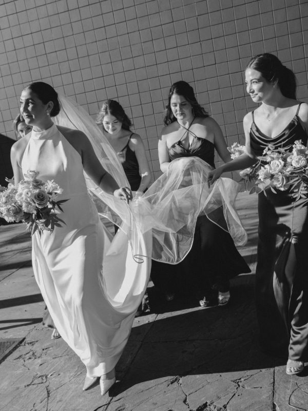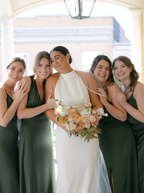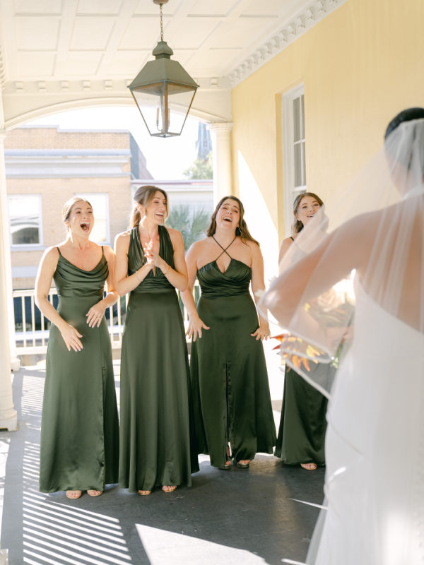 When choosing colors and styles for the bridesmaids’ dresses, Mia wanted the girls to be in something that fit the venue, time of year, and design style. She opted for the perfect shade of green that fit perfectly with her table linens and details.
