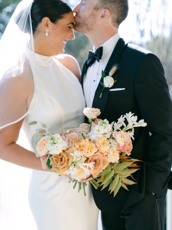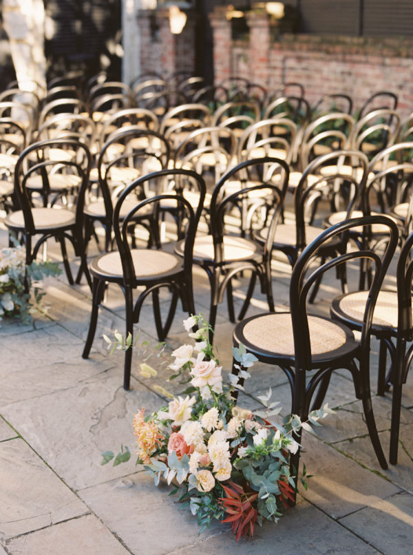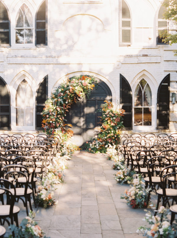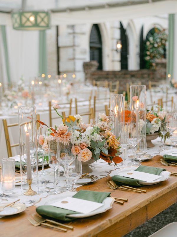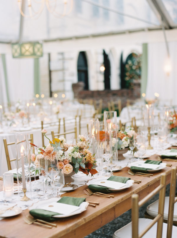 The florals and decor, lush arrangements of soft peach, ivory, and copper tones, were paired with textured greenery and accented with touches of autumn foliage, echoing the season and adding warmth to the design palette. The foliage wove in beautifully with the house’s storied gardens, spilling across tables and framing the ceremony in natural abundance. Candlelight flickered against glass and gold accents, softening the atmosphere into something both luxurious and inviting.