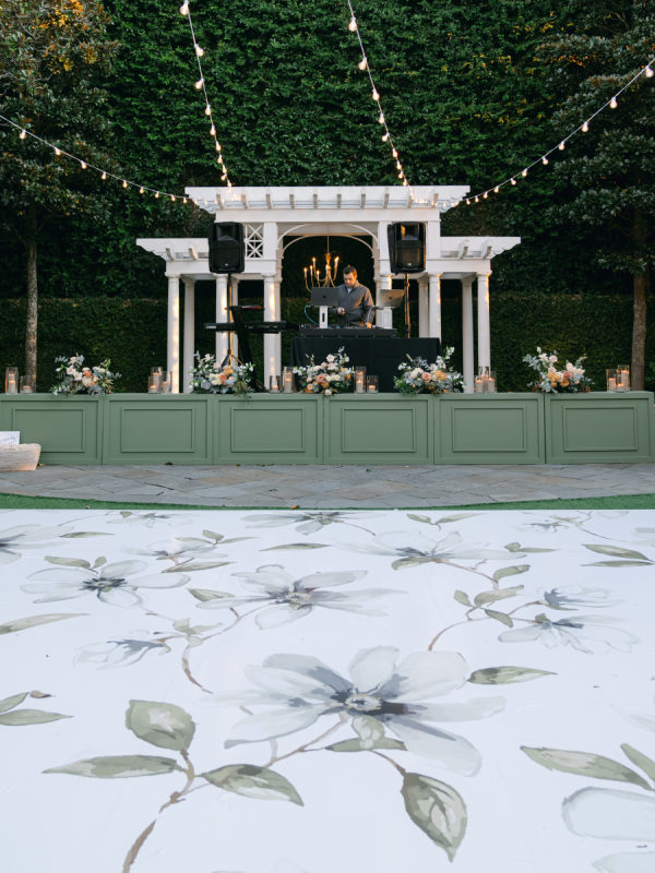 For Mia and Brandon, custom builds became a focal point for their wedding celebration. We designed and curated a custom 20-foot bar that matched perfectly with the lighting fixtures, stage facade, and the florals. A crisp green backdrop with trellis detailing was brought to life with florals and foliage woven throughout, while warm lanterns cast a golden glow overhead. It became a gathering point where guests lingered, sipping cocktails and soaking in the ambience.