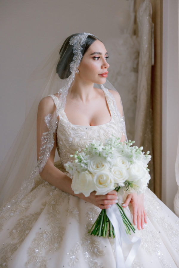 The wedding radiates timeless elegance combined with a regal and refined aesthetic. The atmosphere is characterized by exclusivity and sophistication, with opulent details that evoke grandeur and luxury. Cascading floral installations, shimmering chandeliers, and finely crafted table settings create a breathtakingly lavish environment. The design aimed to curate a truly exclusive and royal experience, where every detail reflected refinement and indulgence. Long banquet tables, set beneath glittering crystal chandeliers and surrounded by lush floral arrangements, offered a majestic setting for guests. The venue was elevated with meticulous decor, blending modern luxury with classic elegance to create a uniquely grand and unforgettable celebration.