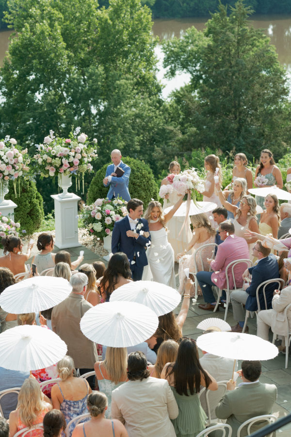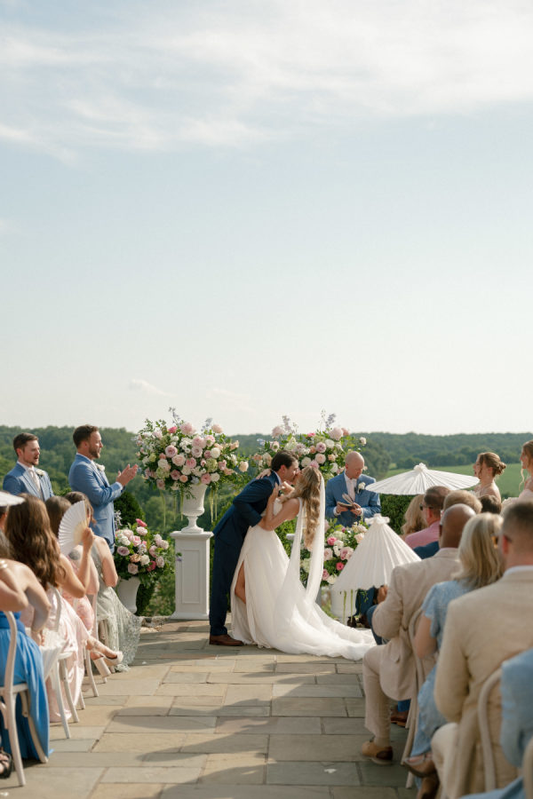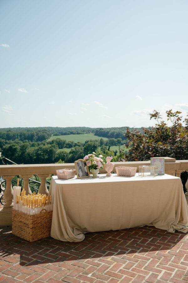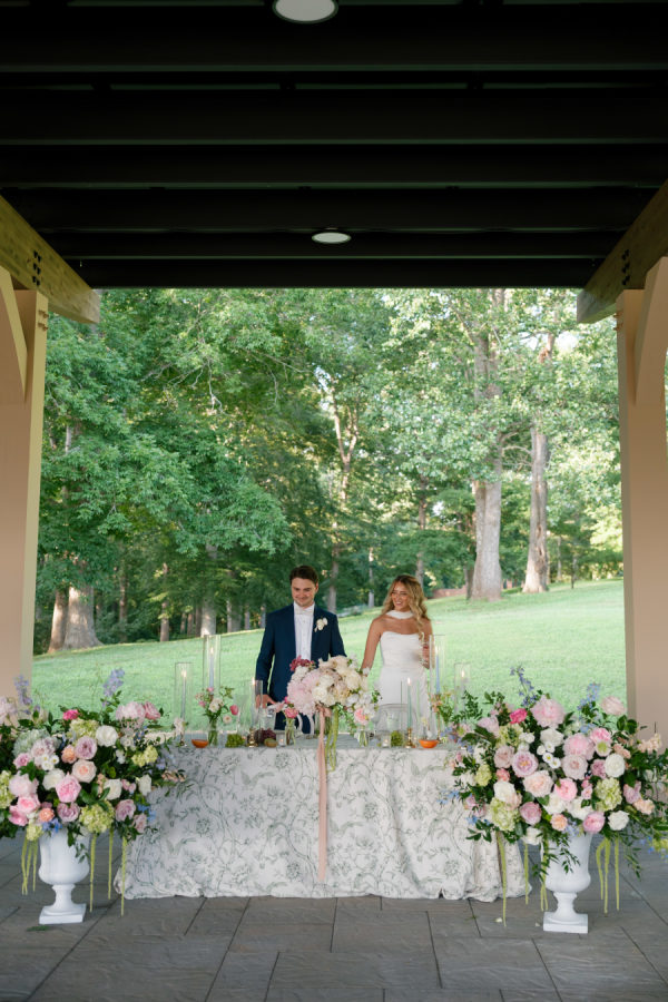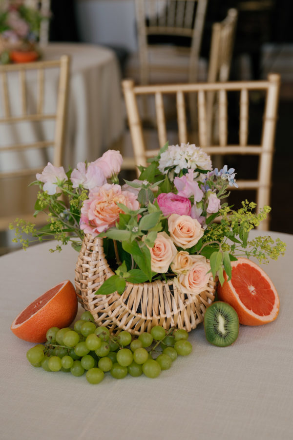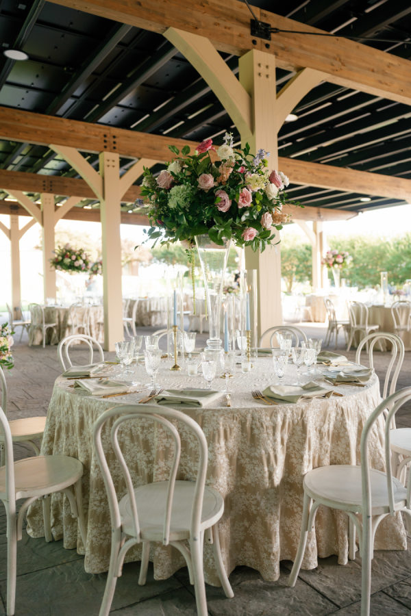 Drawing inspiration from the elegance of the Estate at River Run and the romantic world of Bridgerton, Alyssa and AJ’s wedding design was a whimsical garden fête in celebration of the summer solstice. Florals took center stage—lush, oversized blooms in a palette of pinks, whites, and greens with delicate touches of blue added texture and charm throughout the day. The ceremony unfolded on the estate’s sweeping patio, framed by abundant blooms that echoed the natural beauty of the surroundings. During cocktail hour, petite basket arrangements filled with fresh fruit and florals added a playful yet refined touch. Inside the Summer Court Pavilion, centerpieces delighted the eye with a curated mix of gold taper candles, bud vases, compotes, and elevated arrangements—all nodding to the carefree elegance of a European garden party.