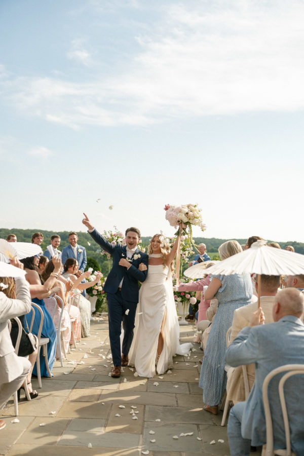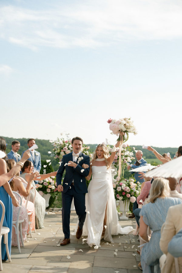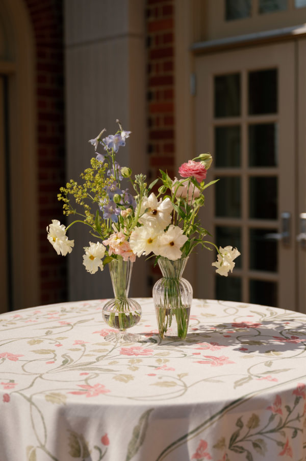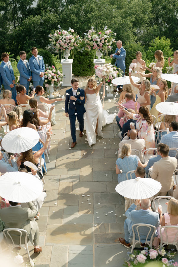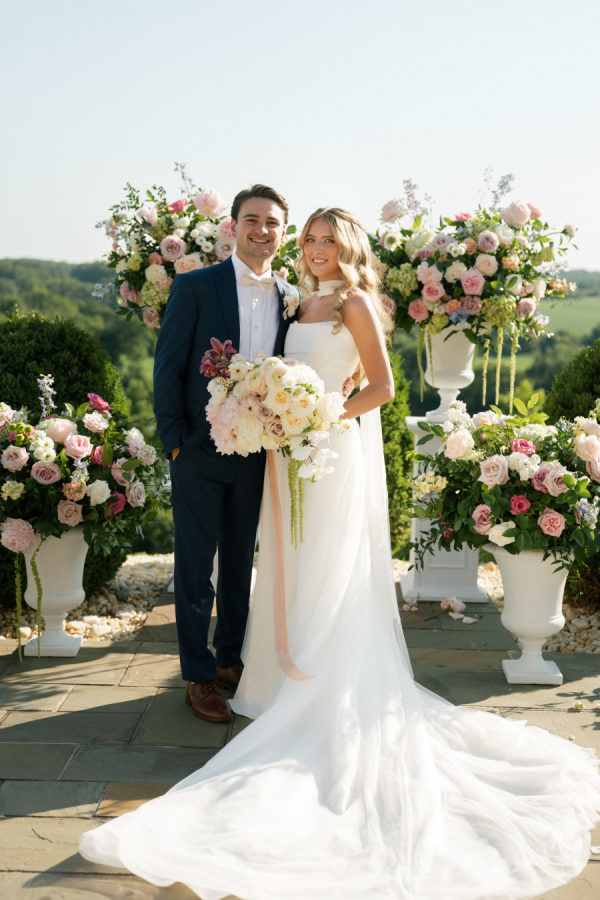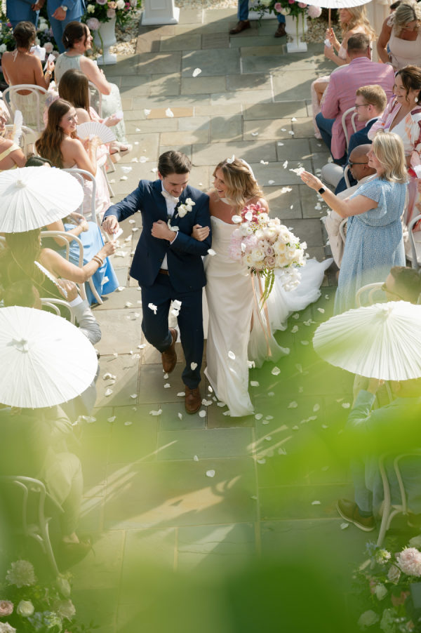 Drawing inspiration from the elegance of the Estate at River Run and the romantic world of Bridgerton, Alyssa and AJ’s wedding design was a whimsical garden fête in celebration of the summer solstice. Florals took center stage—lush, oversized blooms in a palette of pinks, whites, and greens with delicate touches of blue added texture and charm throughout the day. The ceremony unfolded on the estate’s sweeping patio, framed by abundant blooms that echoed the natural beauty of the surroundings. During cocktail hour, petite basket arrangements filled with fresh fruit and florals added a playful yet refined touch. Inside the Summer Court Pavilion, centerpieces delighted the eye with a curated mix of gold taper candles, bud vases, compotes, and elevated arrangements—all nodding to the carefree elegance of a European garden party.