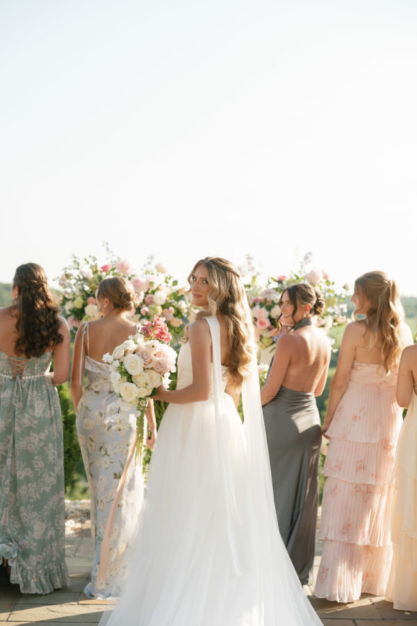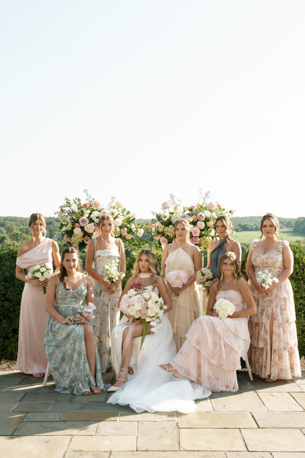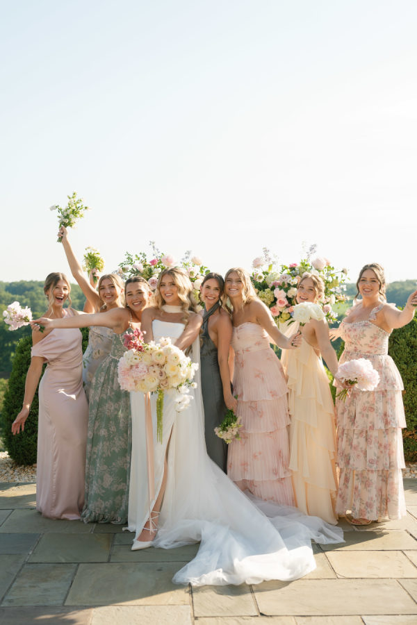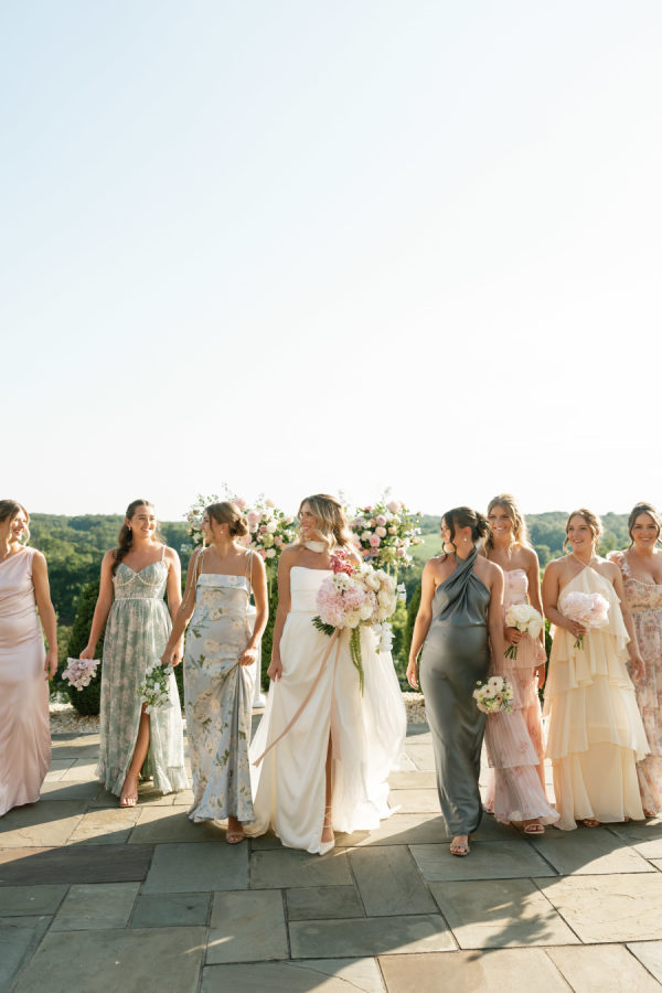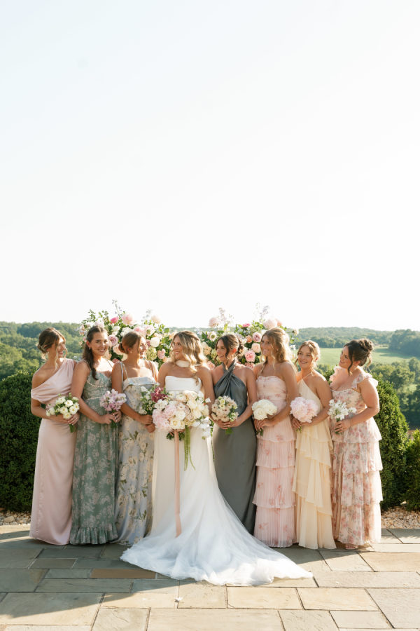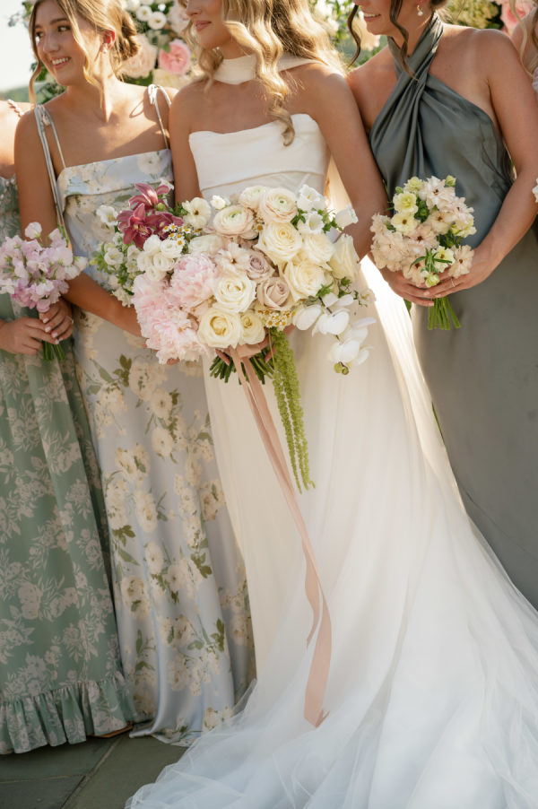 The bride’s bouquet was nothing short of showstopping, cascading with draping blooms, while each bridesmaid carried a chic monofloral bouquet tailored to complement her dress.