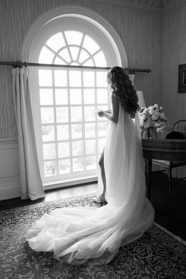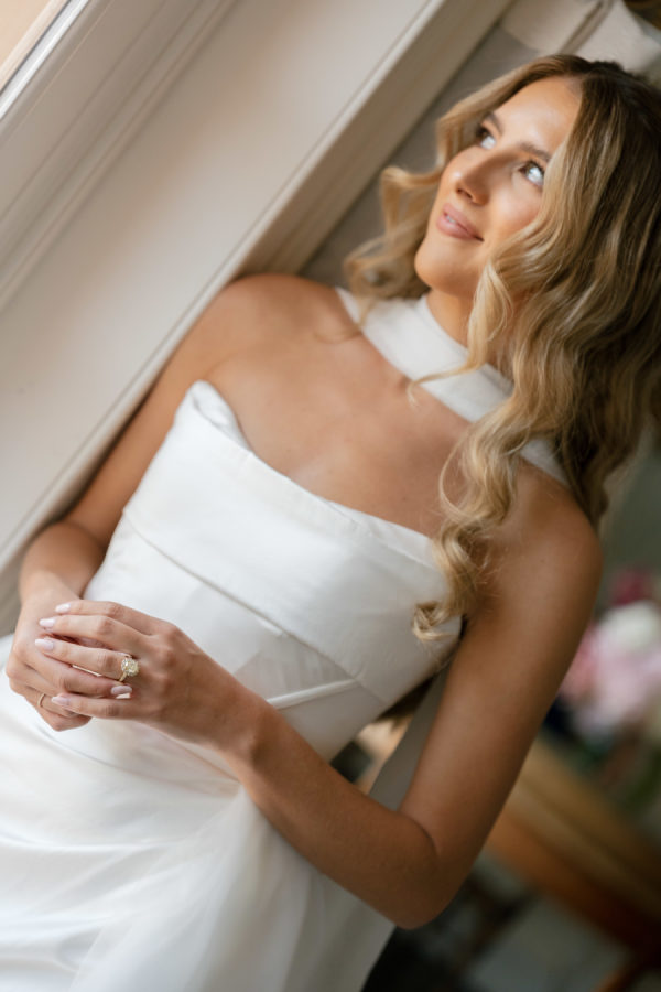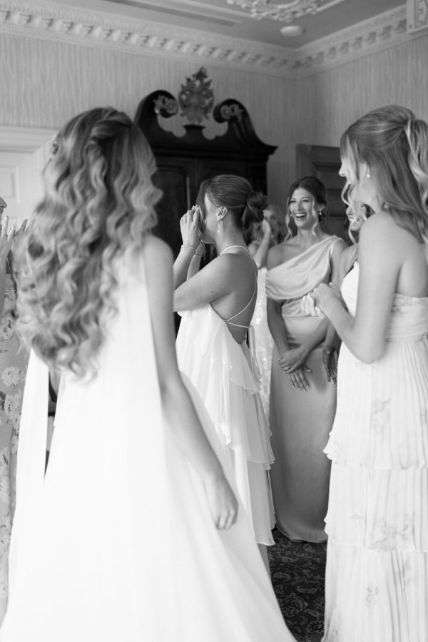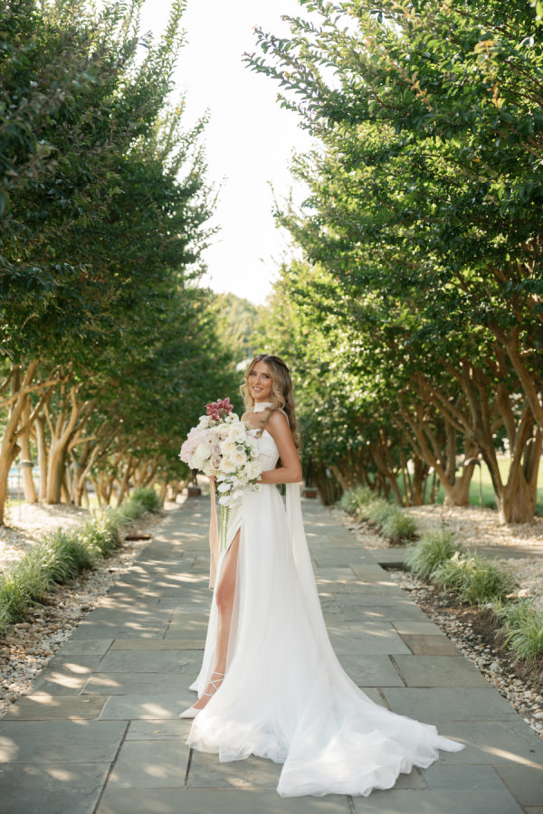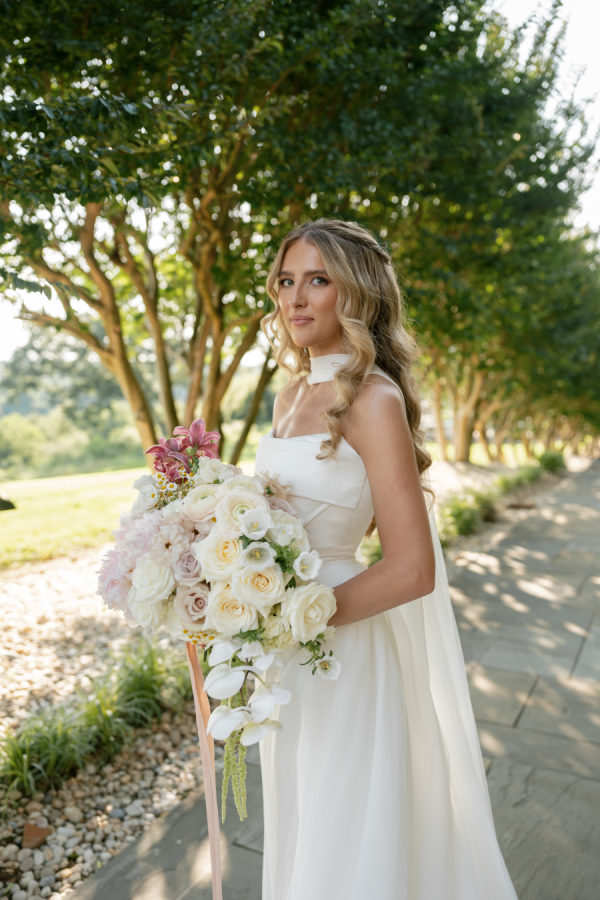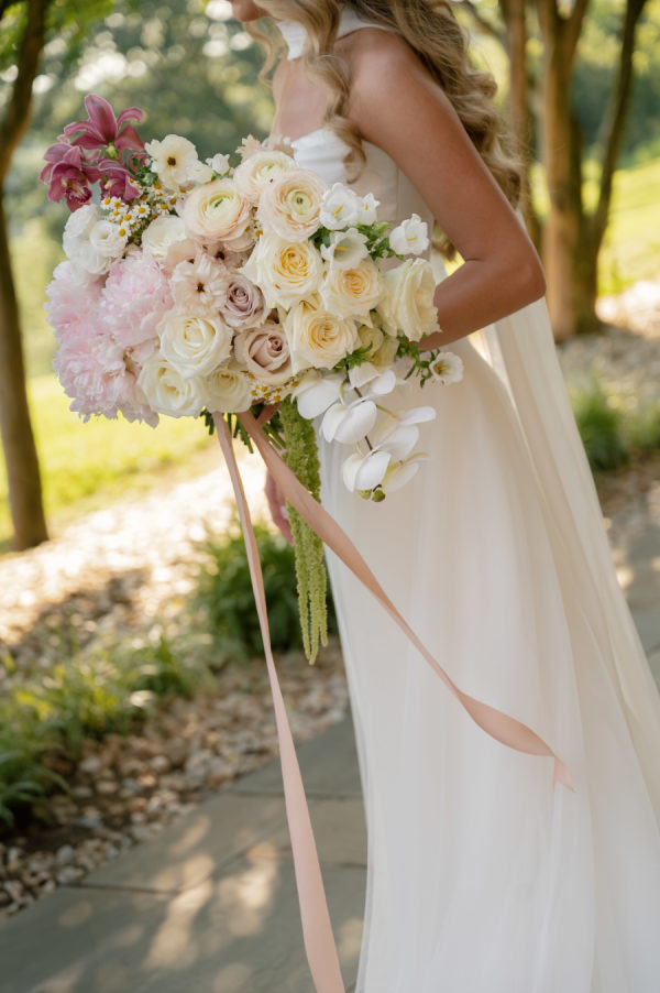 The bride’s bouquet was nothing short of showstopping, cascading with draping blooms, while each bridesmaid carried a chic monofloral bouquet tailored to complement her dress.